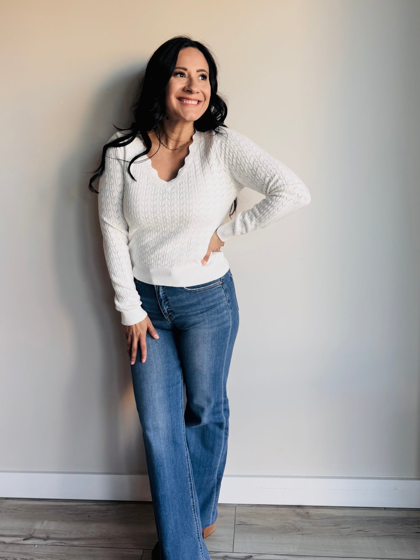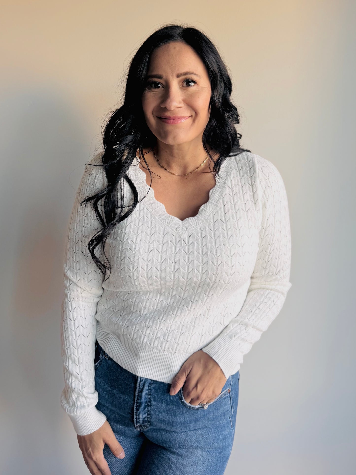 Lottie Scallop Trim V-Neck Top - Ivory