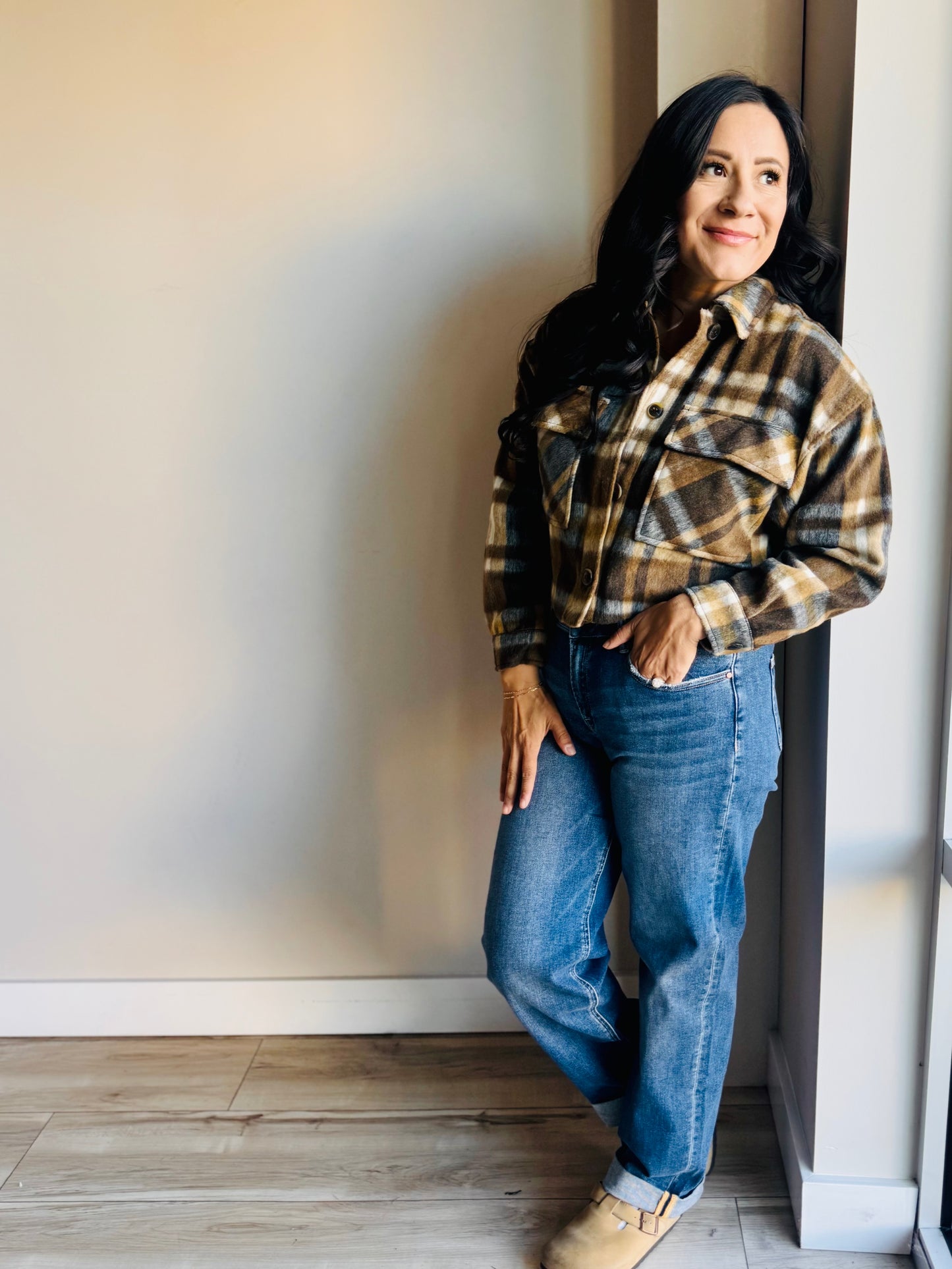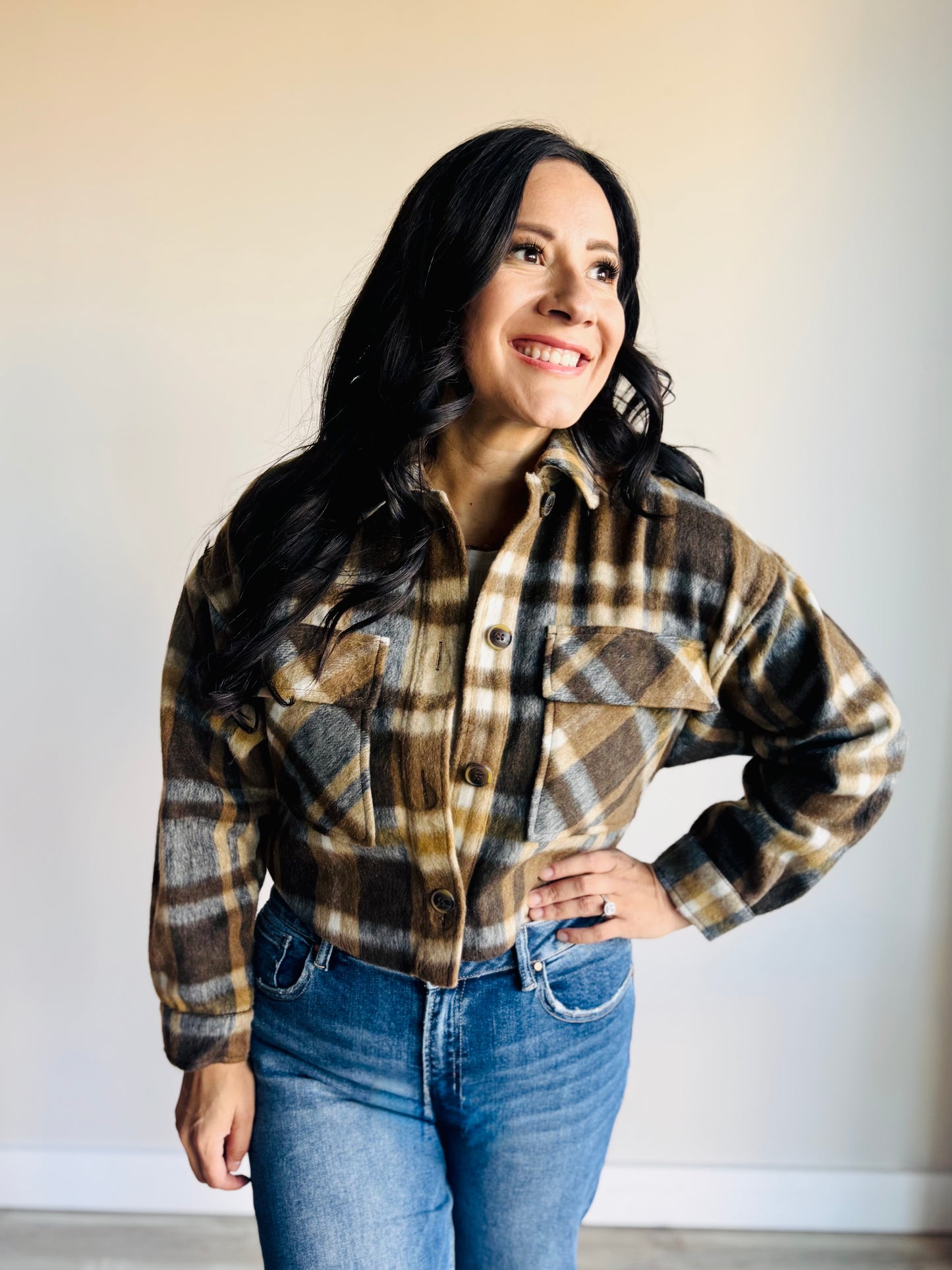 Mandy Plaid Cropped Shacket - Brown