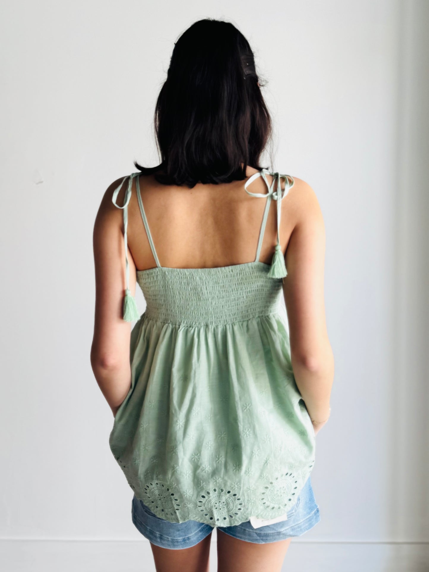 Regular price $18.00This adorable eyelet lace babydoll cami features fully functional buttons, a flattering v-neck, smock backing, and lined for extra comfort. The tassel tie straps add a touch of bohemian charm. Perfect for a sunny day out, this top is a must-have in your wardrobe.