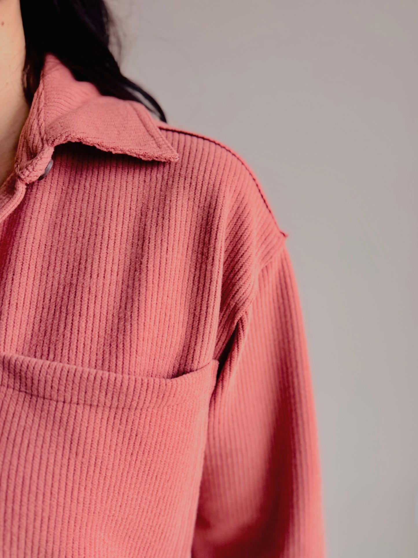 This long-sleeve collared button-down features a structured rib knit fabric that moves with you, complemented by buttoned cuffs for a polished finish. The exposed seams add contemporary edge, while the back yoke detail and U-hem create a flattering silhouette.