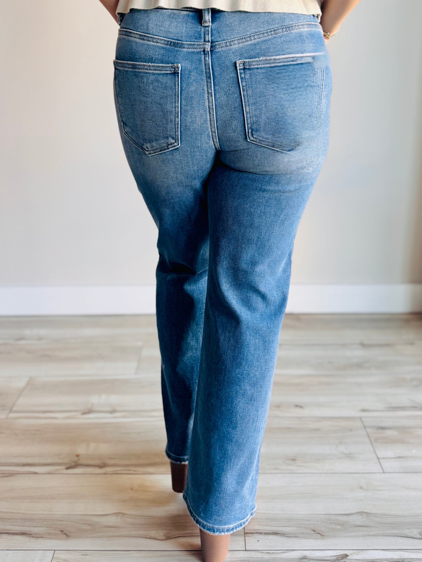 This denim offers a refined take on distressed jeans, featuring a high-rise waist that enhances silhouette definition and a straight leg cut for timeless versatility. The front body distressing adds subtle, lived-in character without compromising a polished look. Crafted to balance contemporary edge with classic shape, these jeans provide both comfort and style ideal for an elevated casual wardrobe.