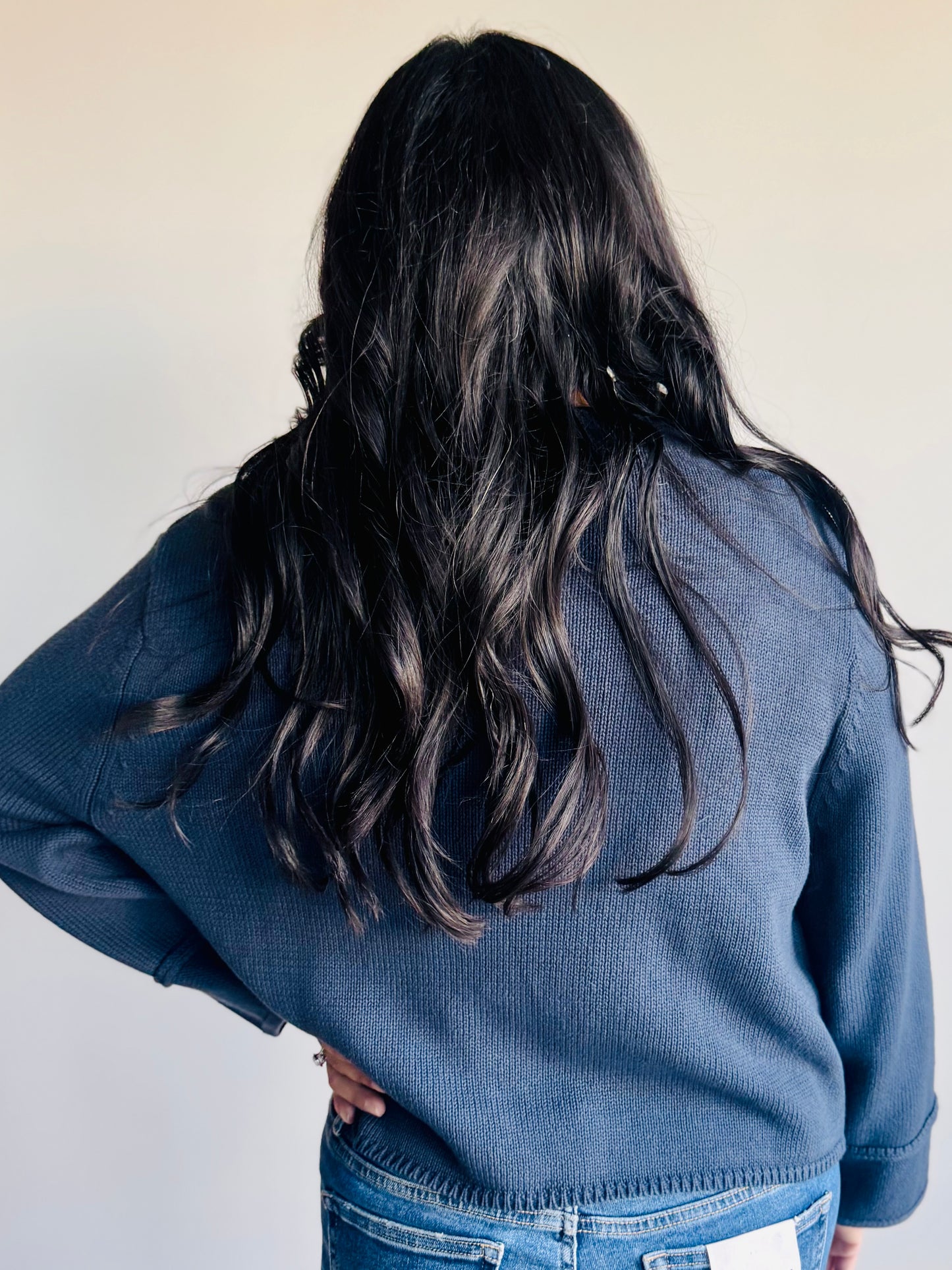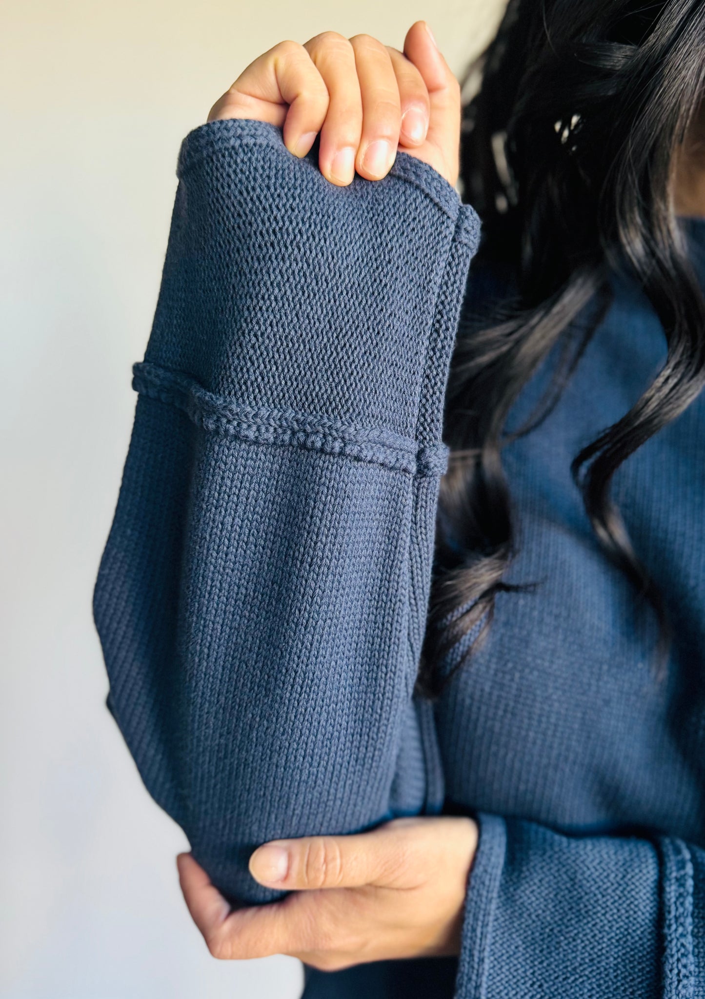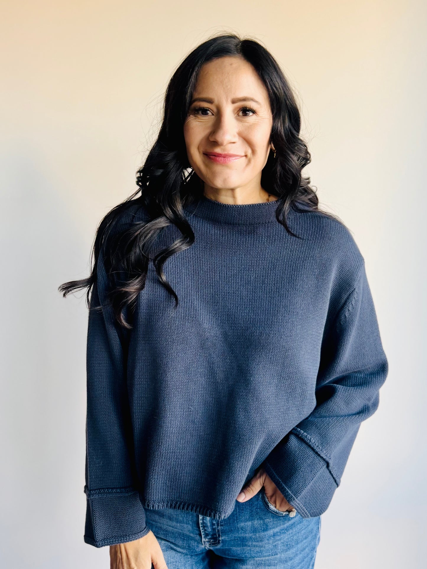 This basic knit design is elevated by wide stitch details that add subtle texture and style. Perfect for layering or wearing on its own, it offers warmth and a unique look that feels effortlessly chic.