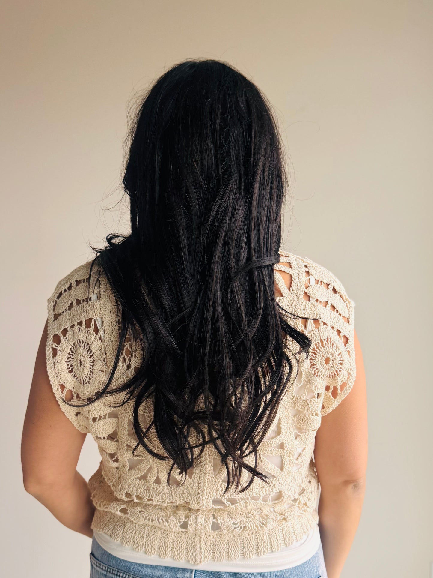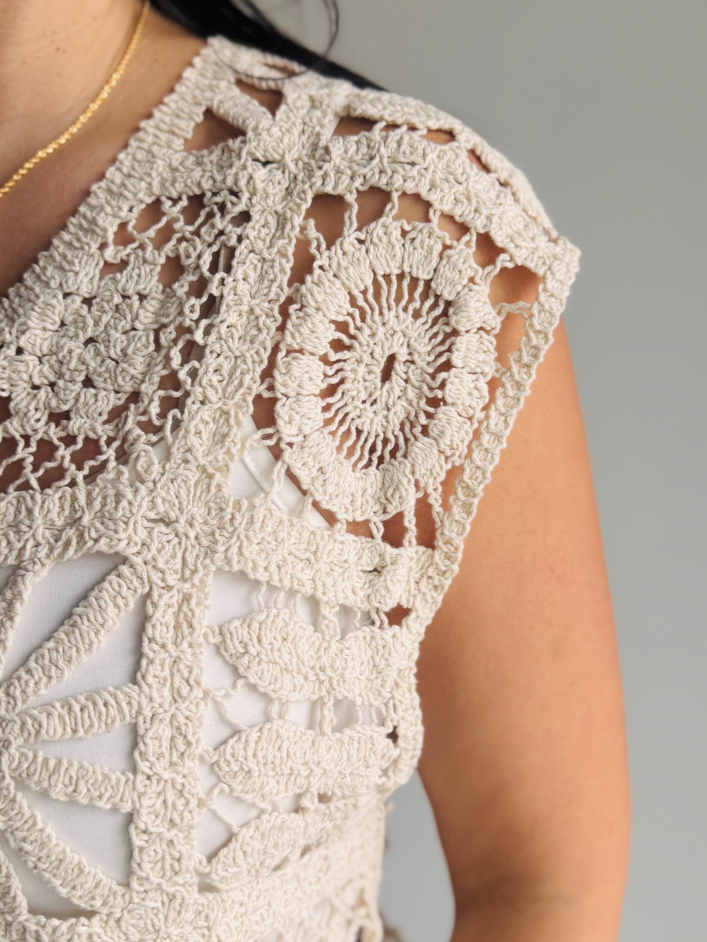 The Renae Macrame Vest Top features intricate macrame detailing in a natural neutral tone with a flattering V-neck design. Layer it or wear it solo for versatile, effortless style that works with any outfit.