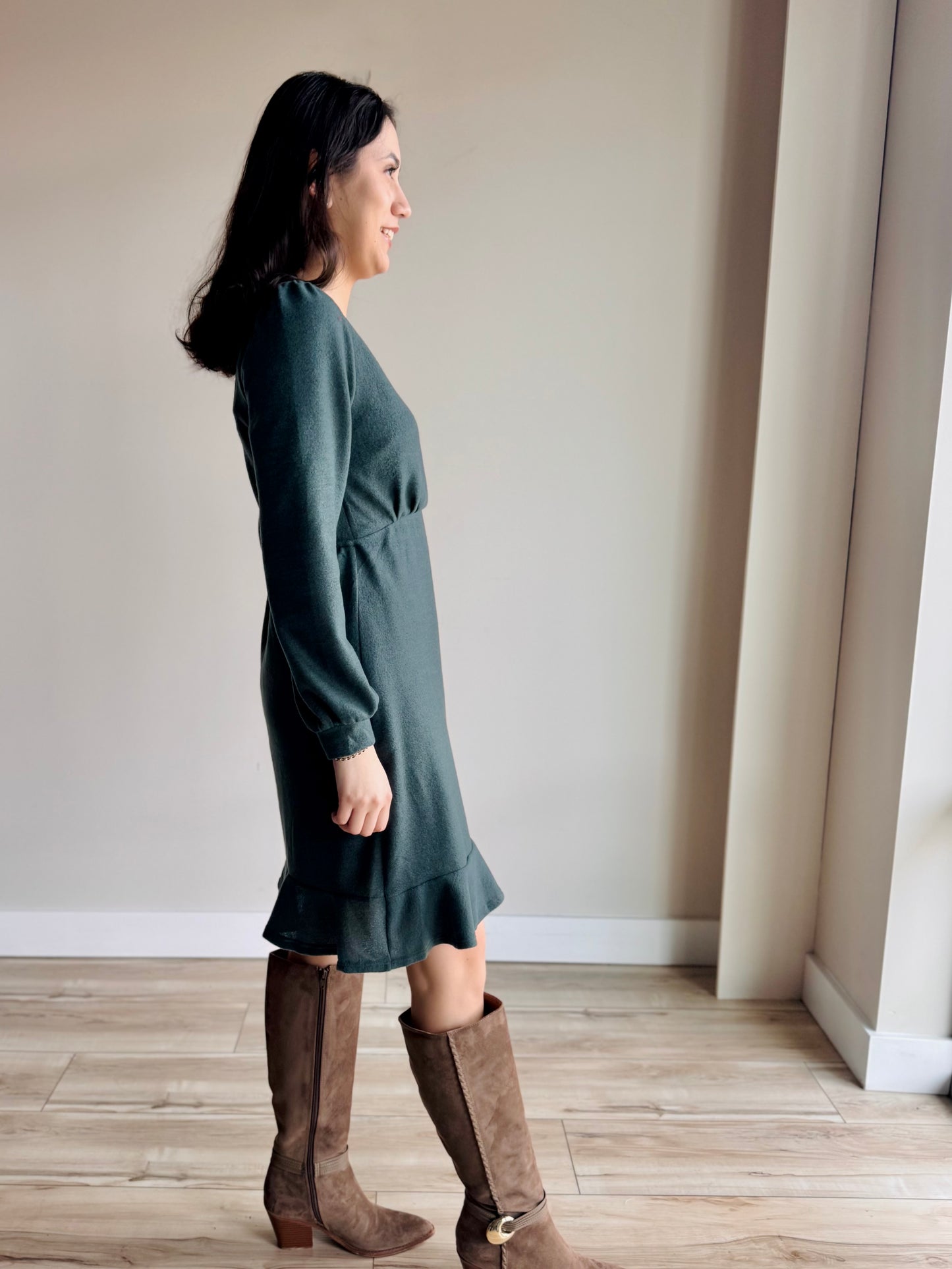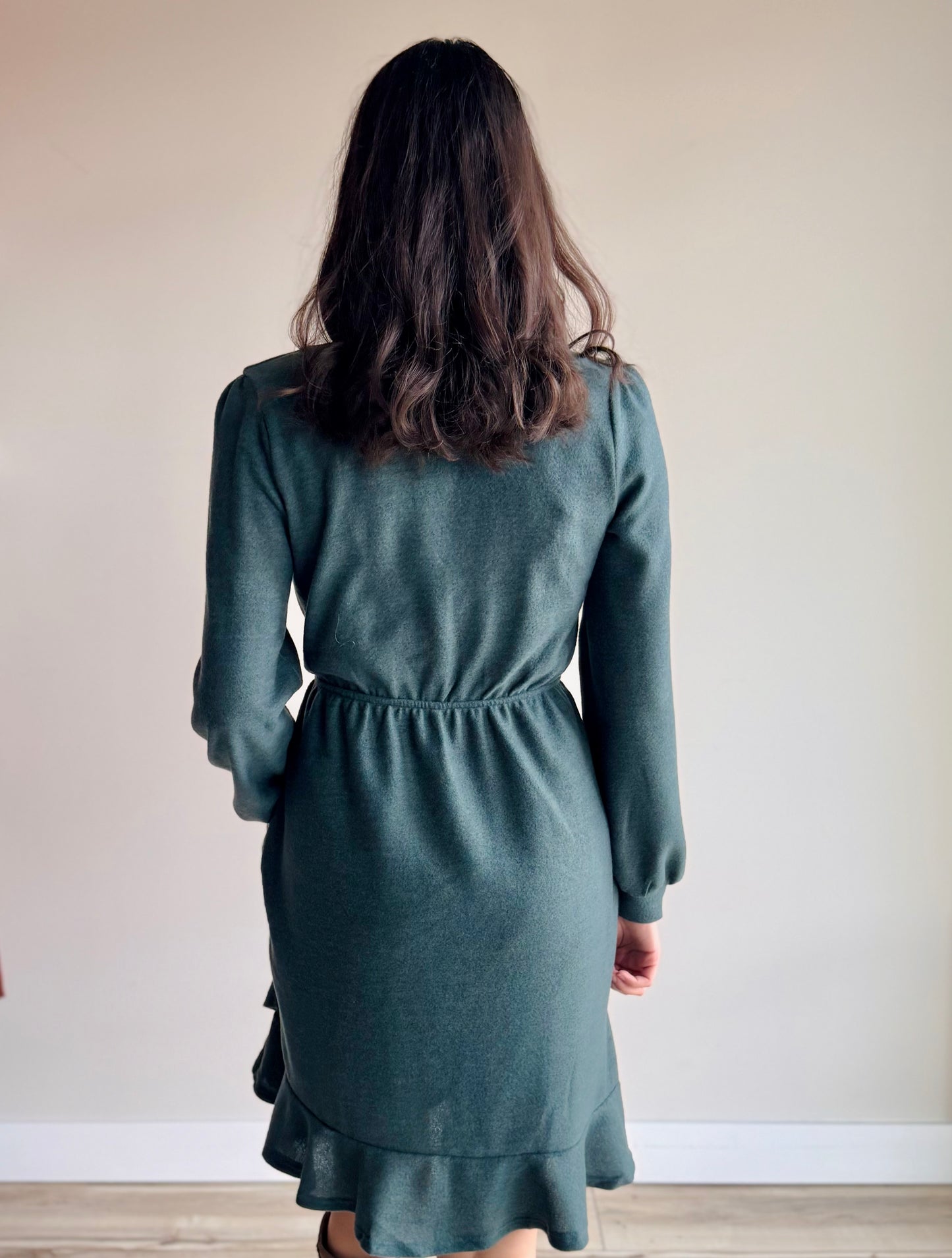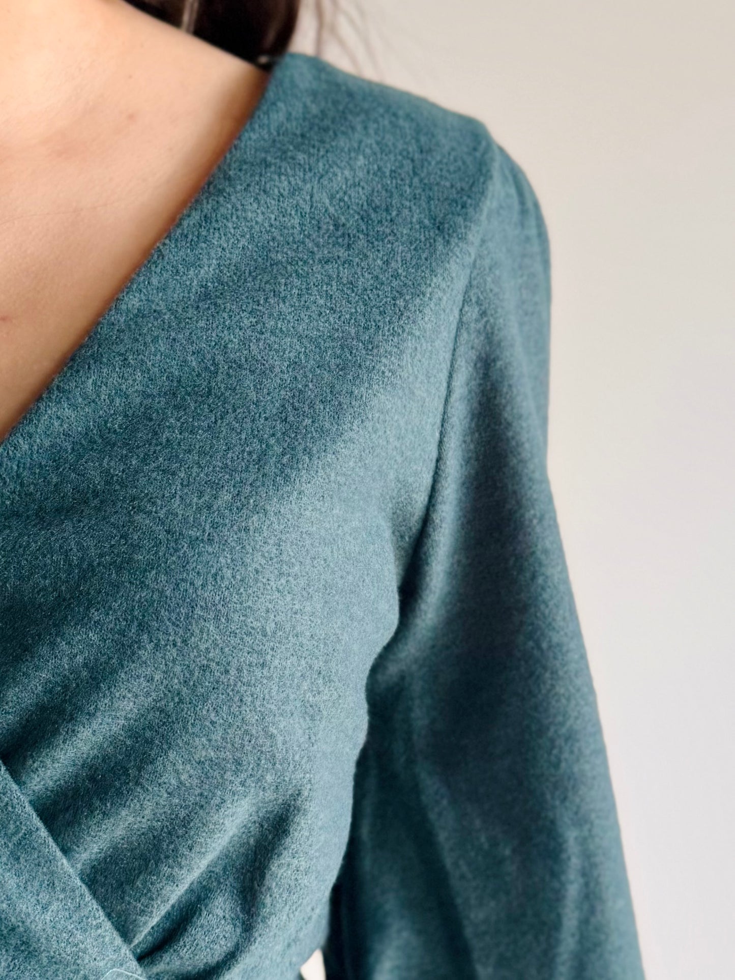 Crafted from a luxuriously soft sweater material, this piece features a flattering surplice v-neckline that creates a refined silhouette. Long sleeves with fixed cuffs provide polished structure, while the flowy design and delicate ruffle hem add movement and charm.