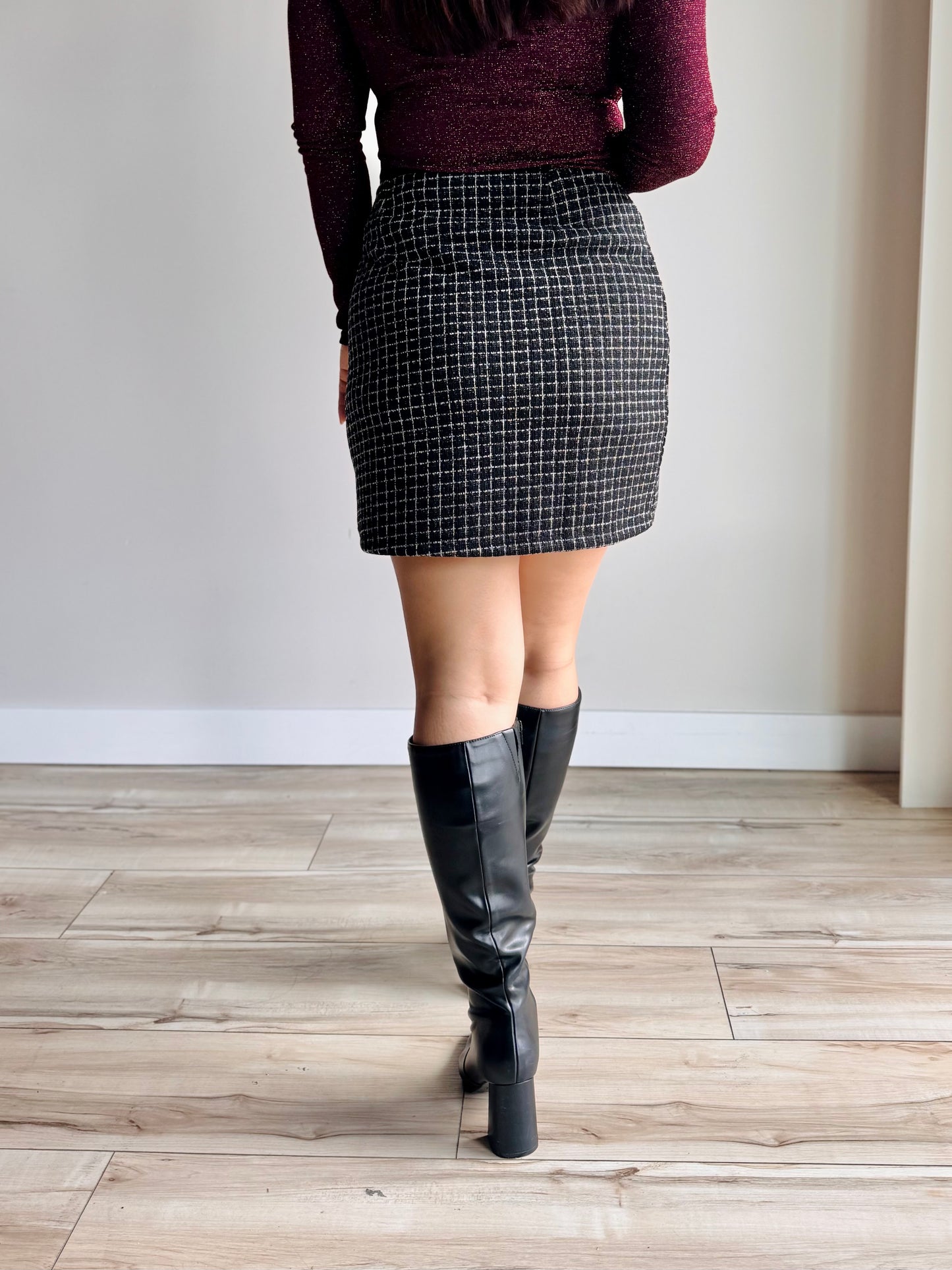 Front view of Ellie tweed mini skirt with structured fit and textured fabric