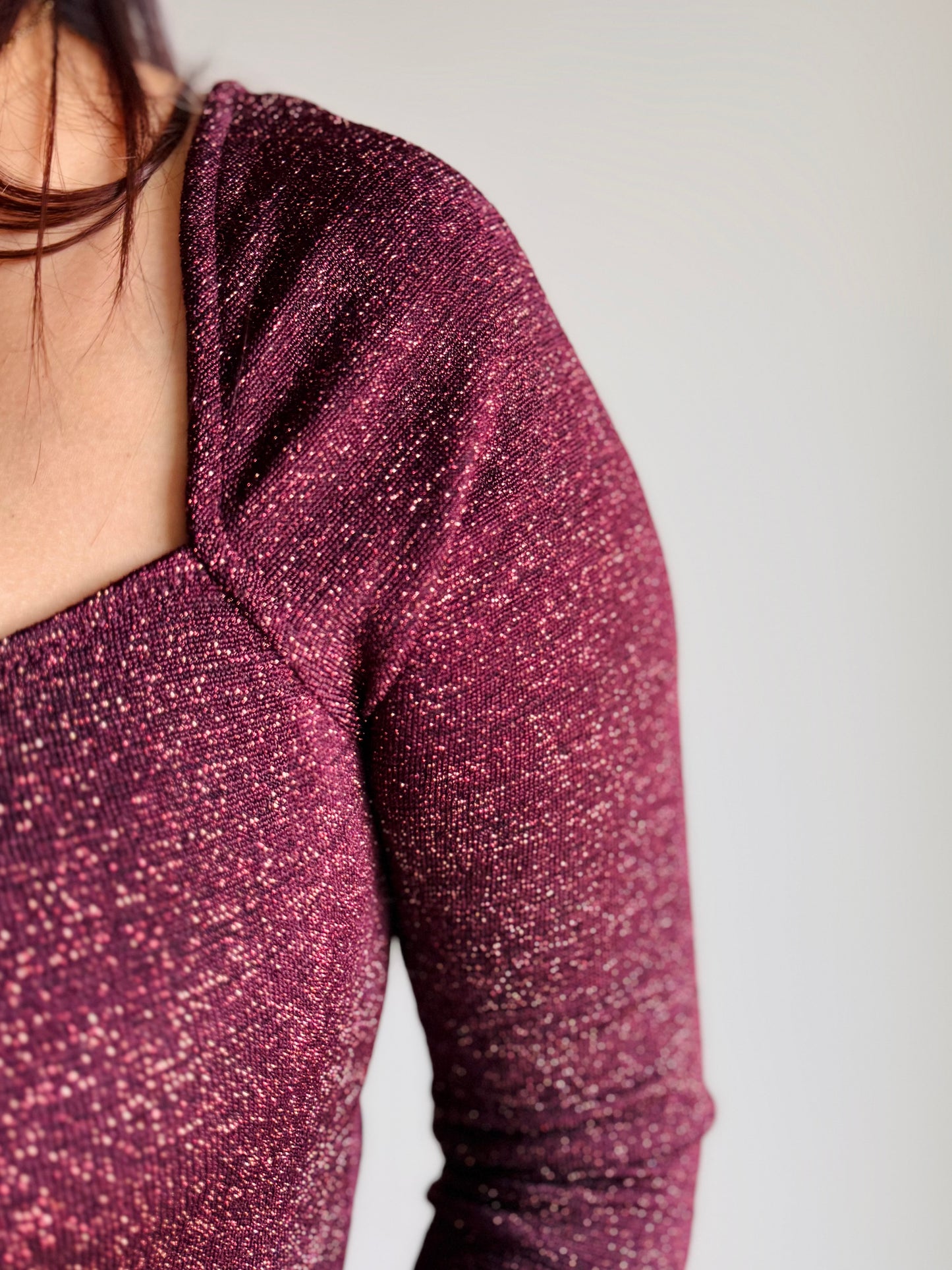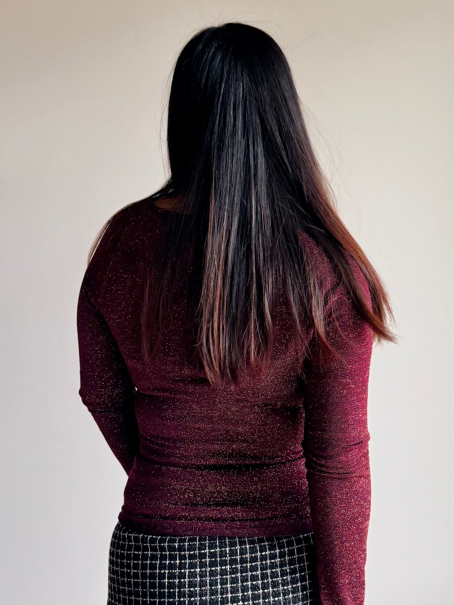 The flattering deep neckline creates an elegant silhouette, while the all-over shimmer detail catches light beautifully for festive occasions and special evenings. Crafted with a luxurious ribbed fabric that hugs your curves in all the right ways, this versatile piece transitions seamlessly from holiday parties to upscale dinners. The Maggie Top delivers timeless glamour with modern edge.