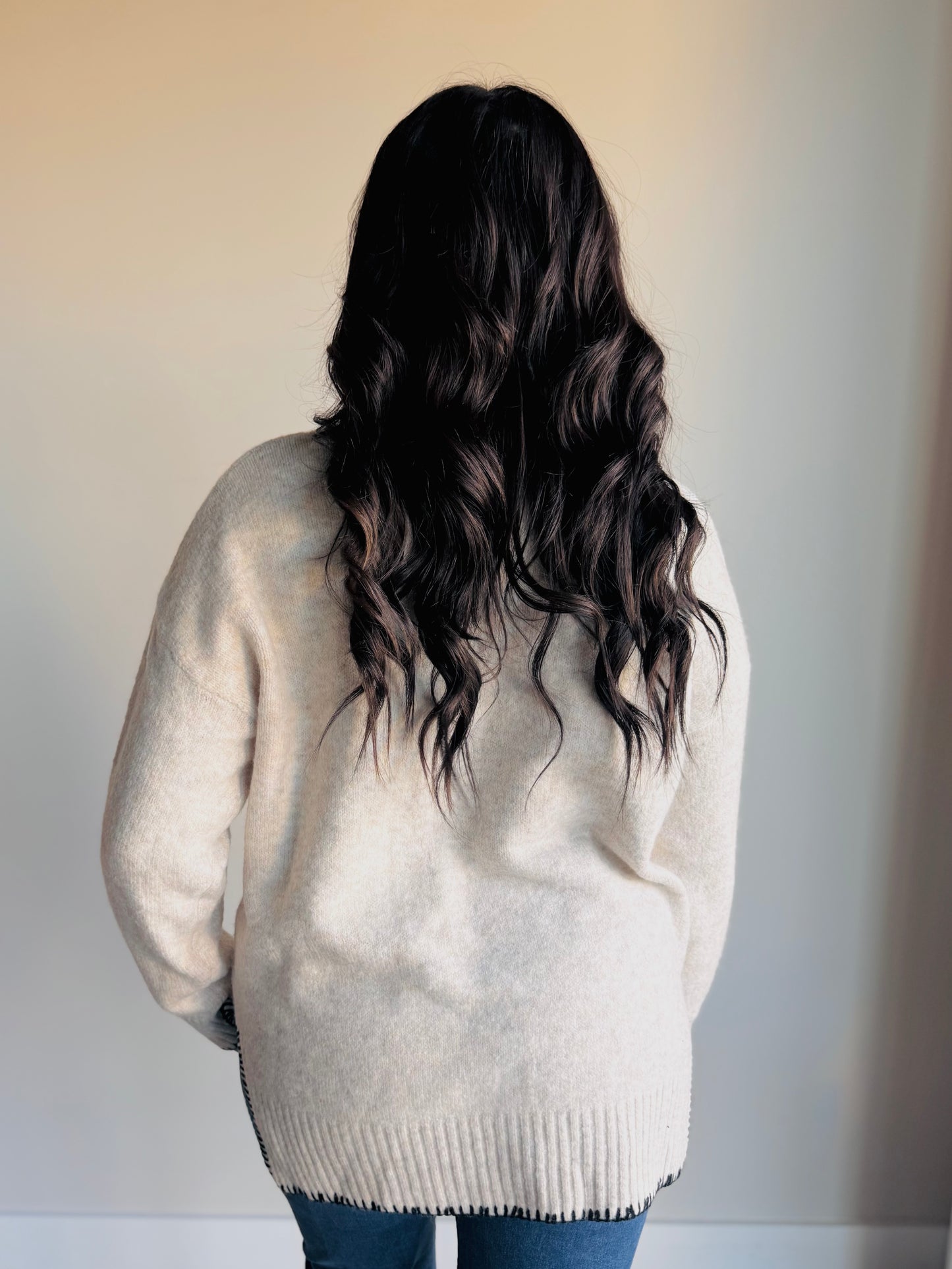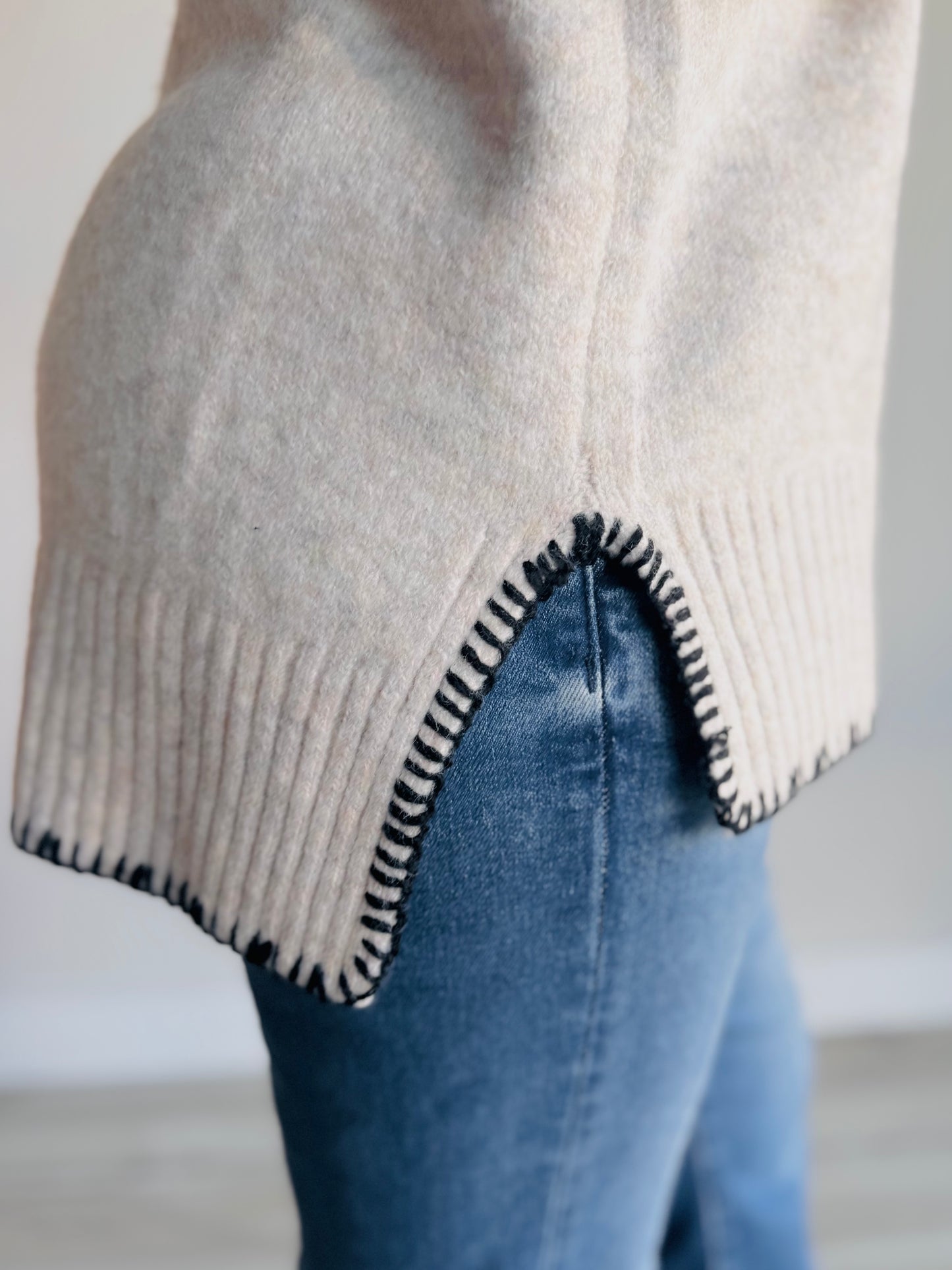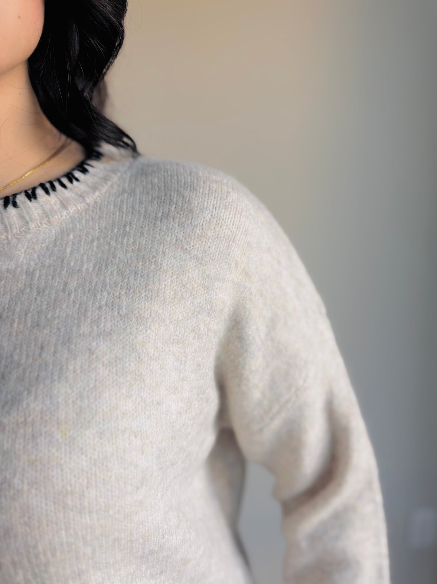 The Amelia Sweater showcases a refined contrast hem stitch detail that adds subtle visual interest to its clean silhouette. Designed as a classic pullover with a smooth round neckline, this sweater offers both timeless style and comfortable wearability.