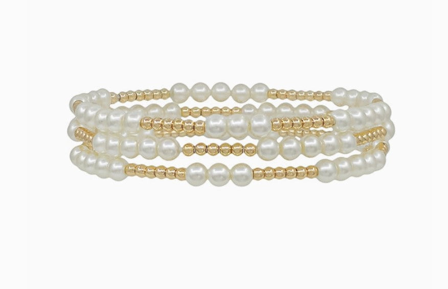 Crafted with water-resistant materials, these small gold bead and pearl bracelets come in a set of 3, perfect for stacking. The stretch design makes them easy to wear and the timeless design ensures they will never go out of style.