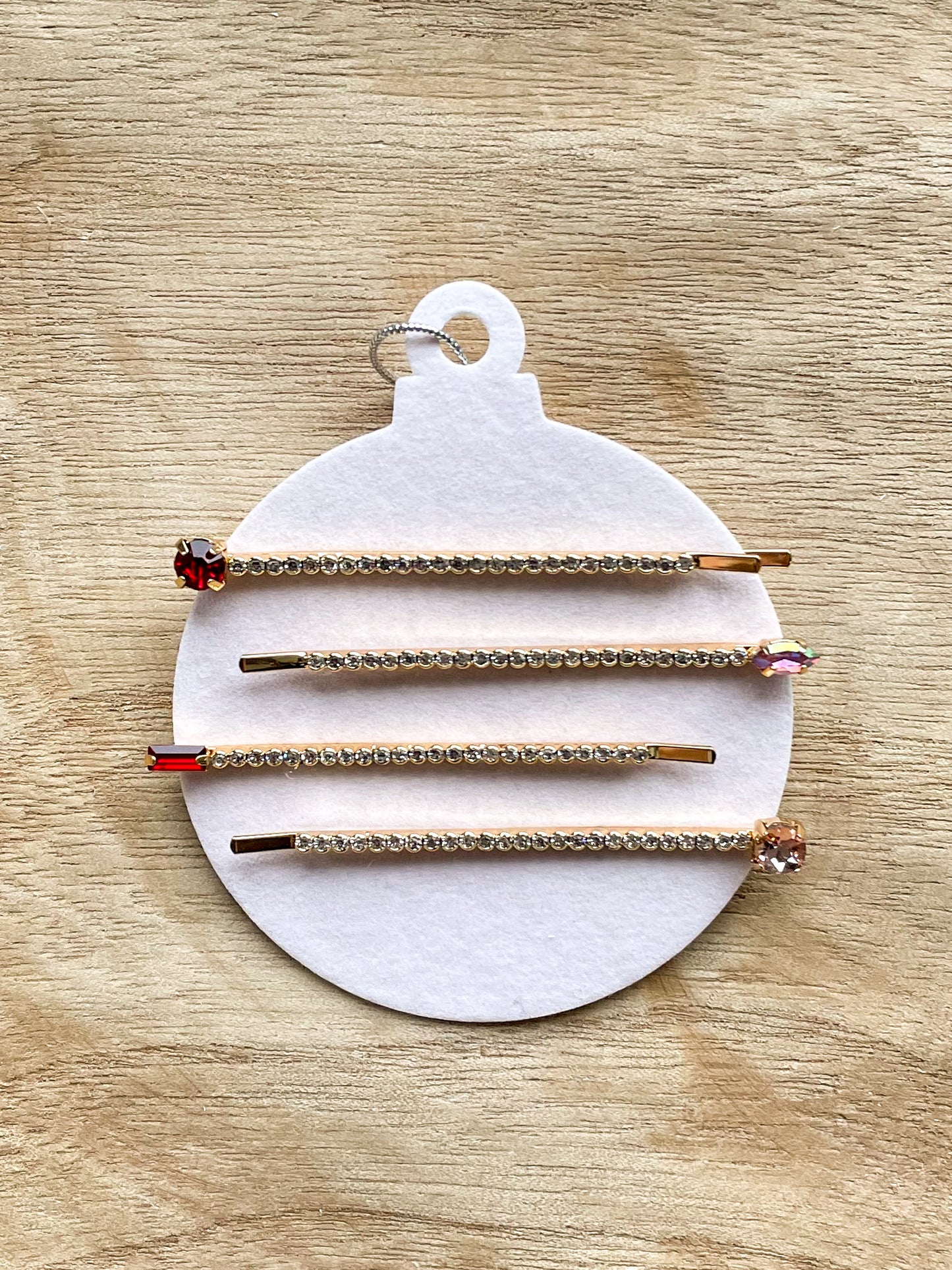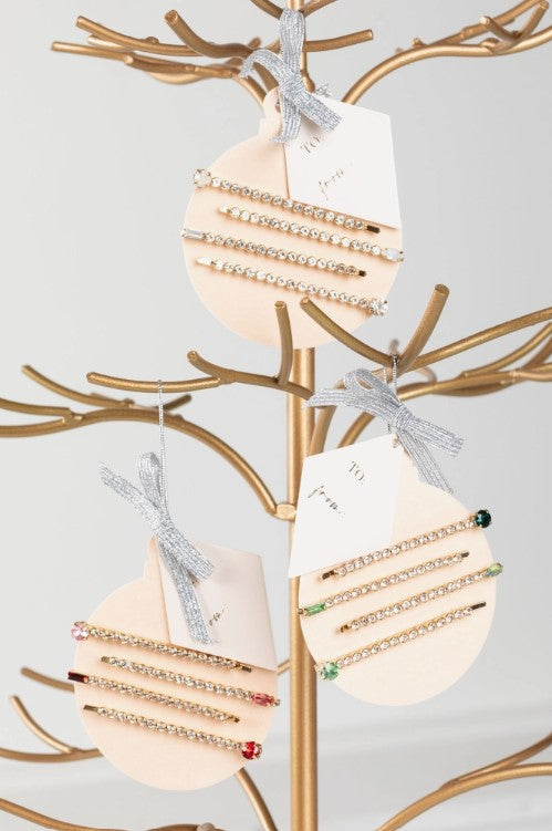 Gift the perfect holiday accessory! Adorned with crystals and gems, these beautiful bobby pins dress up any hairstyle with a touch of glam. Packaged on a festive ornament card, these bobby pins make the perfect gift for friends and family!