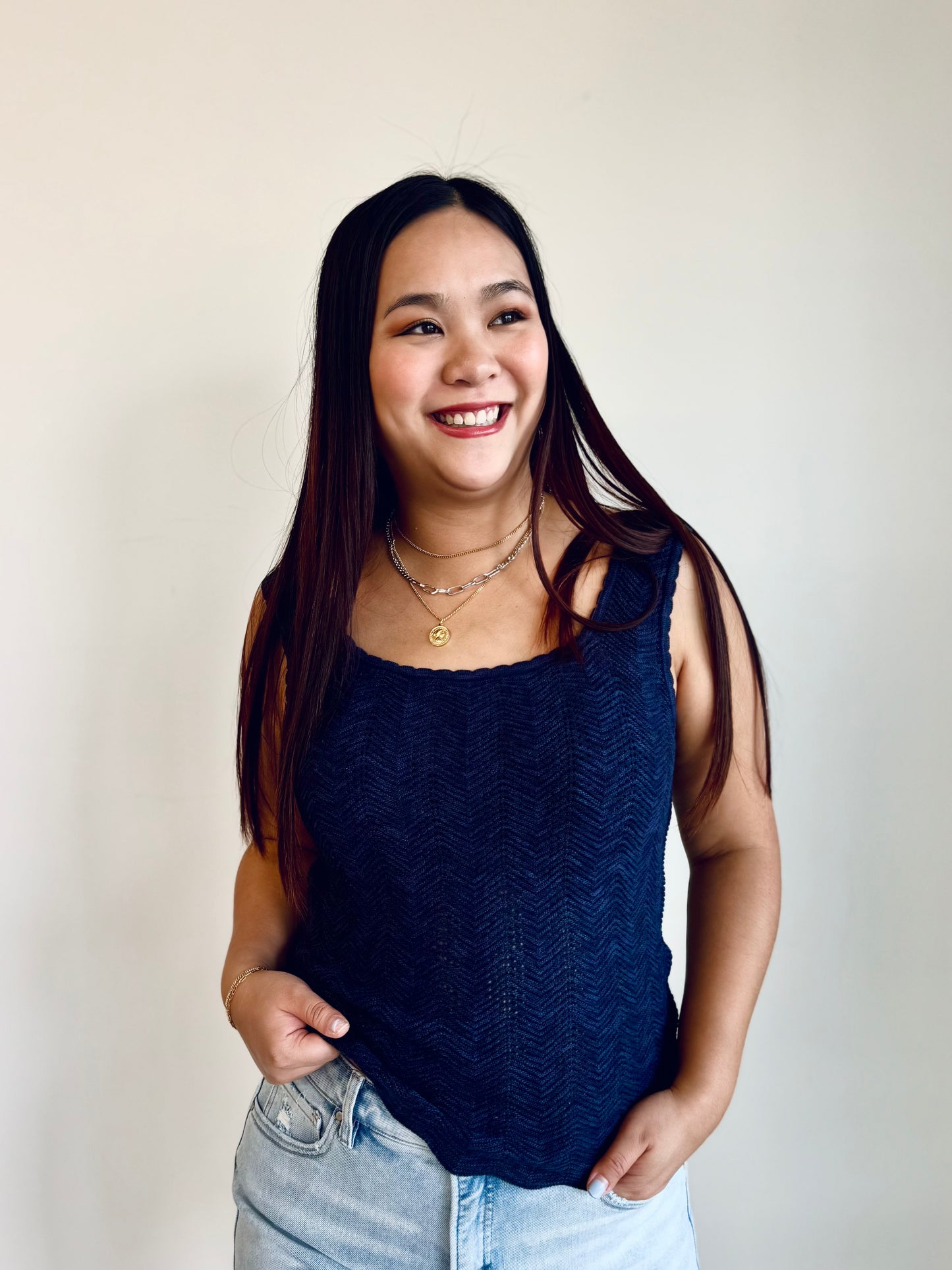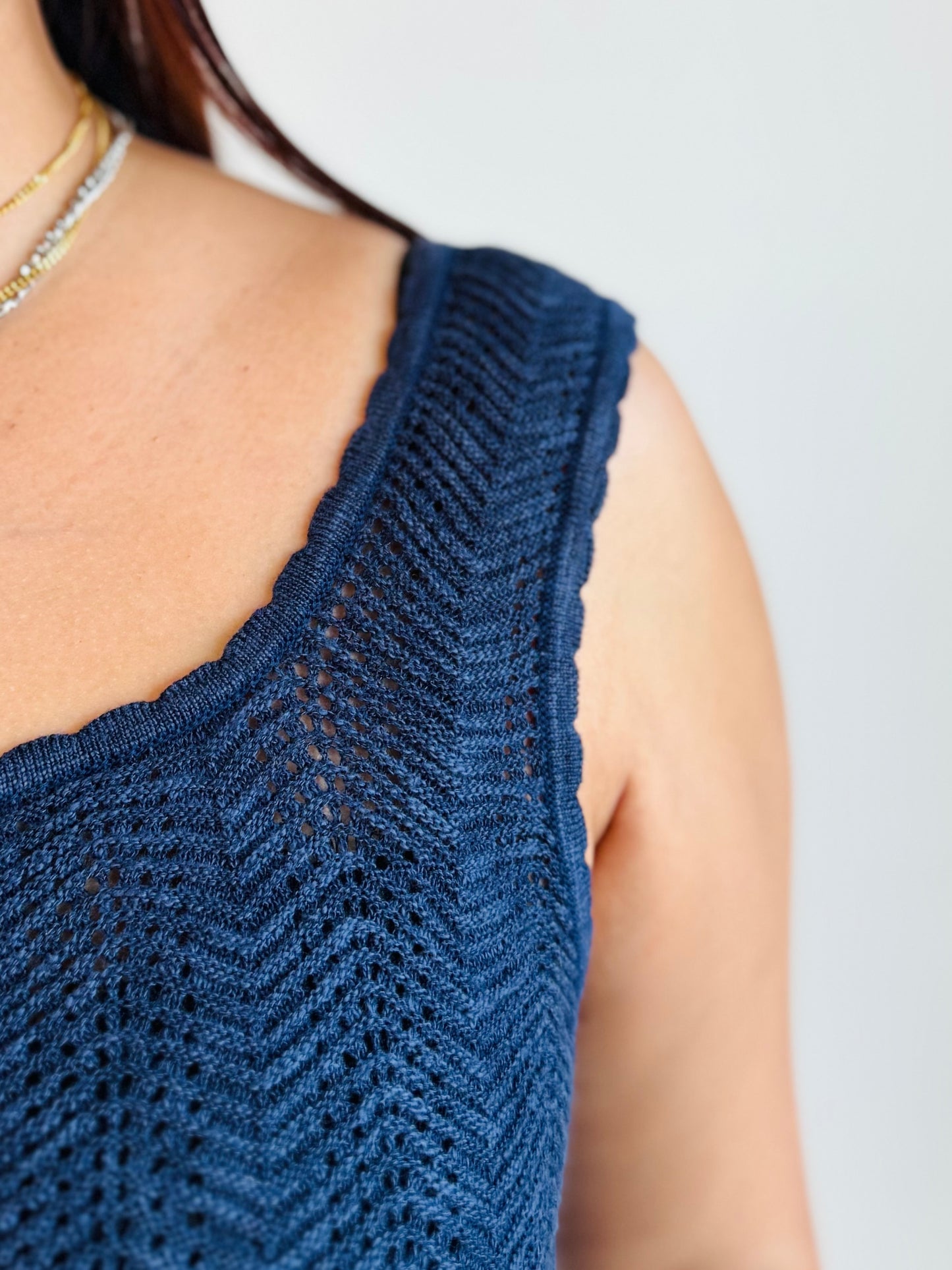 Regular price $18.00Made with soft knit fabric, this fitted tank top features a delicate scalloped hem that adds a touch of femininity. Perfect for layering or wearing on its own, this top is a versatile addition to your wardrobe.