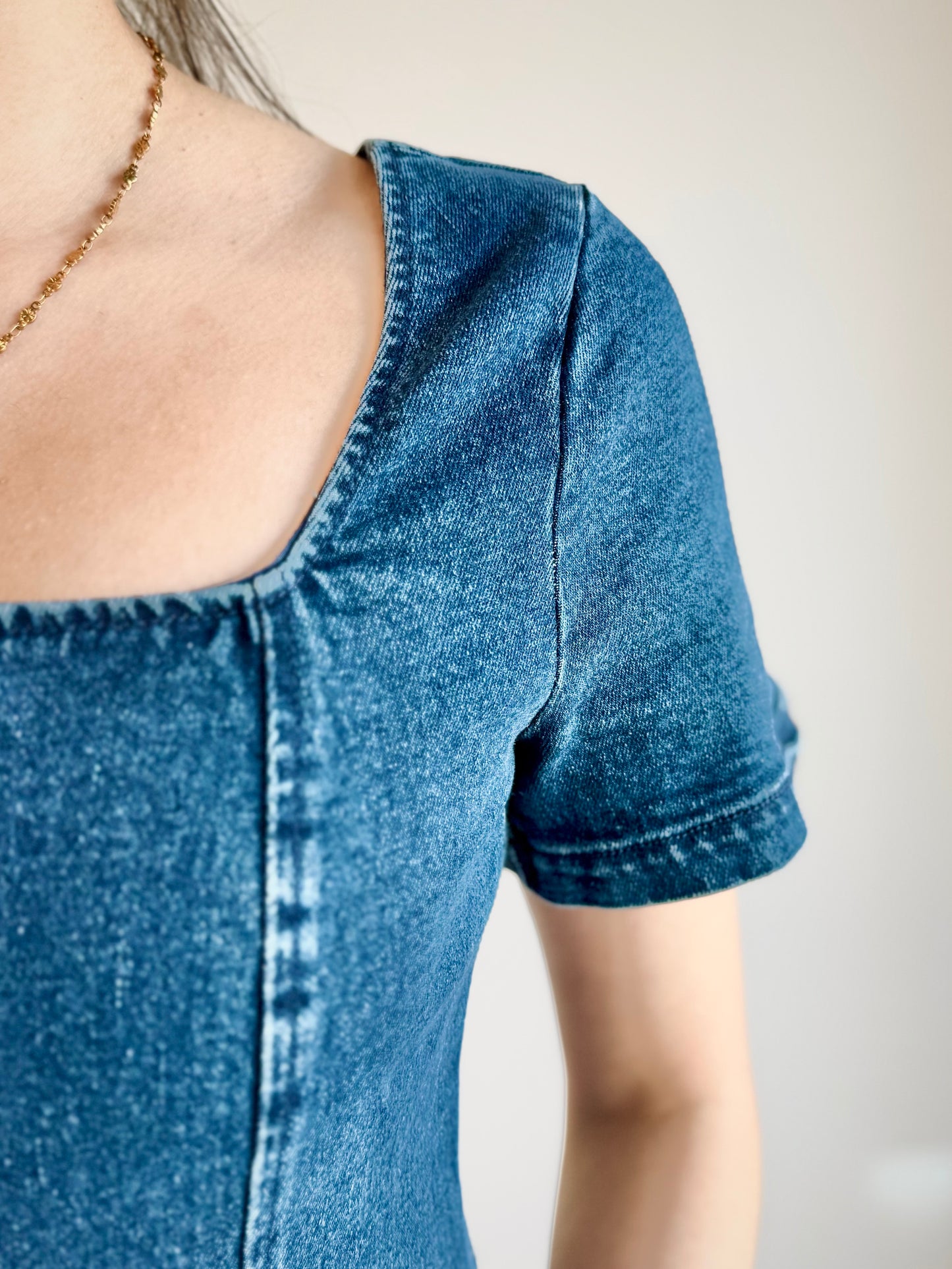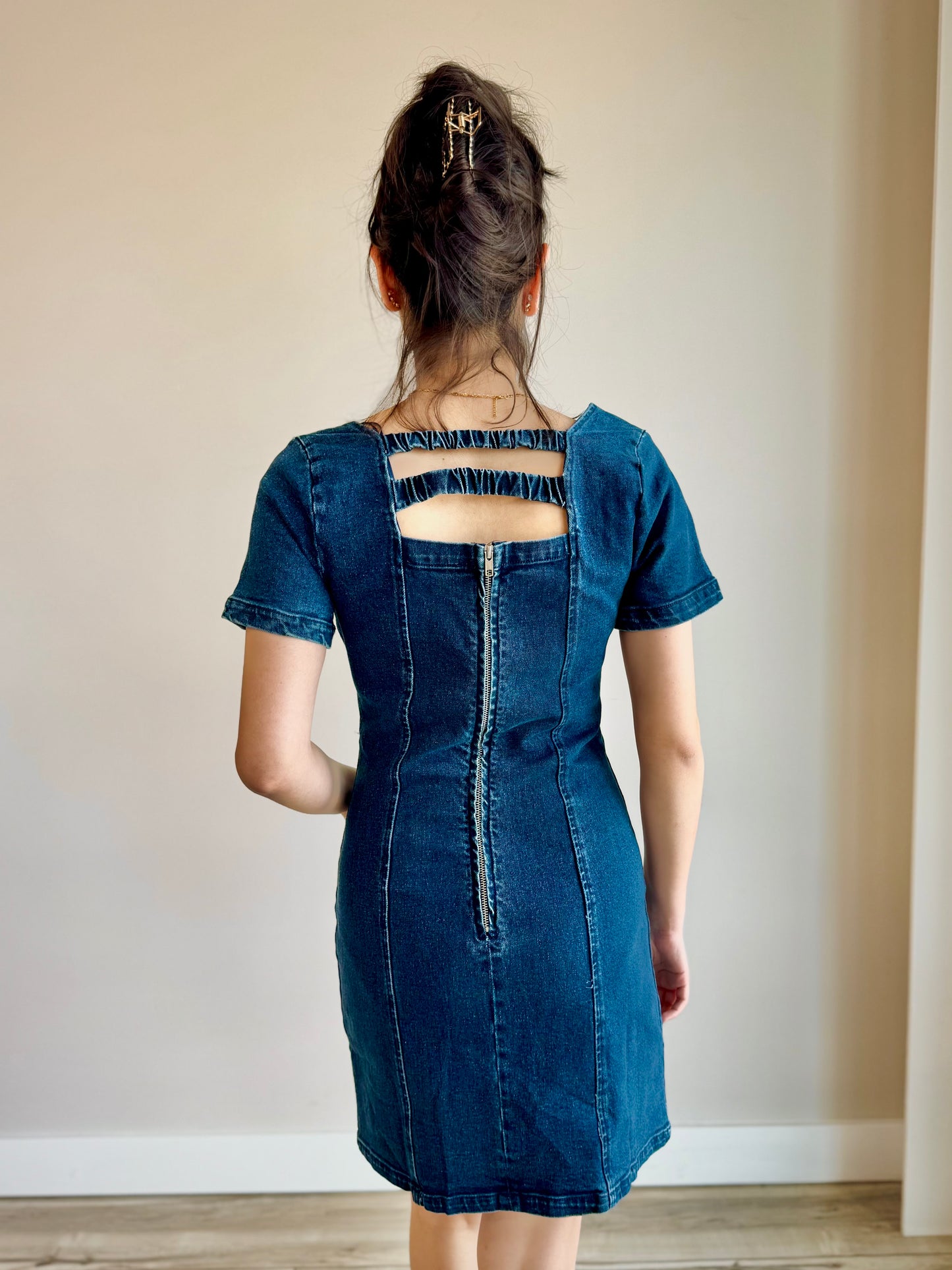 Regular price $34.10This must-have dress features a flattering square neckline and comfortable elastic back straps for a perfect fit. The zipper allows for easy on and off while the short sleeves add a touch of elegance. Make a statement in this versatile and stylish denim dress!