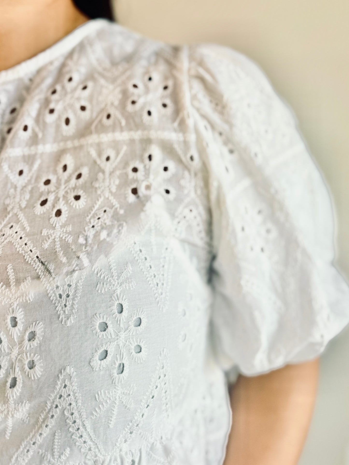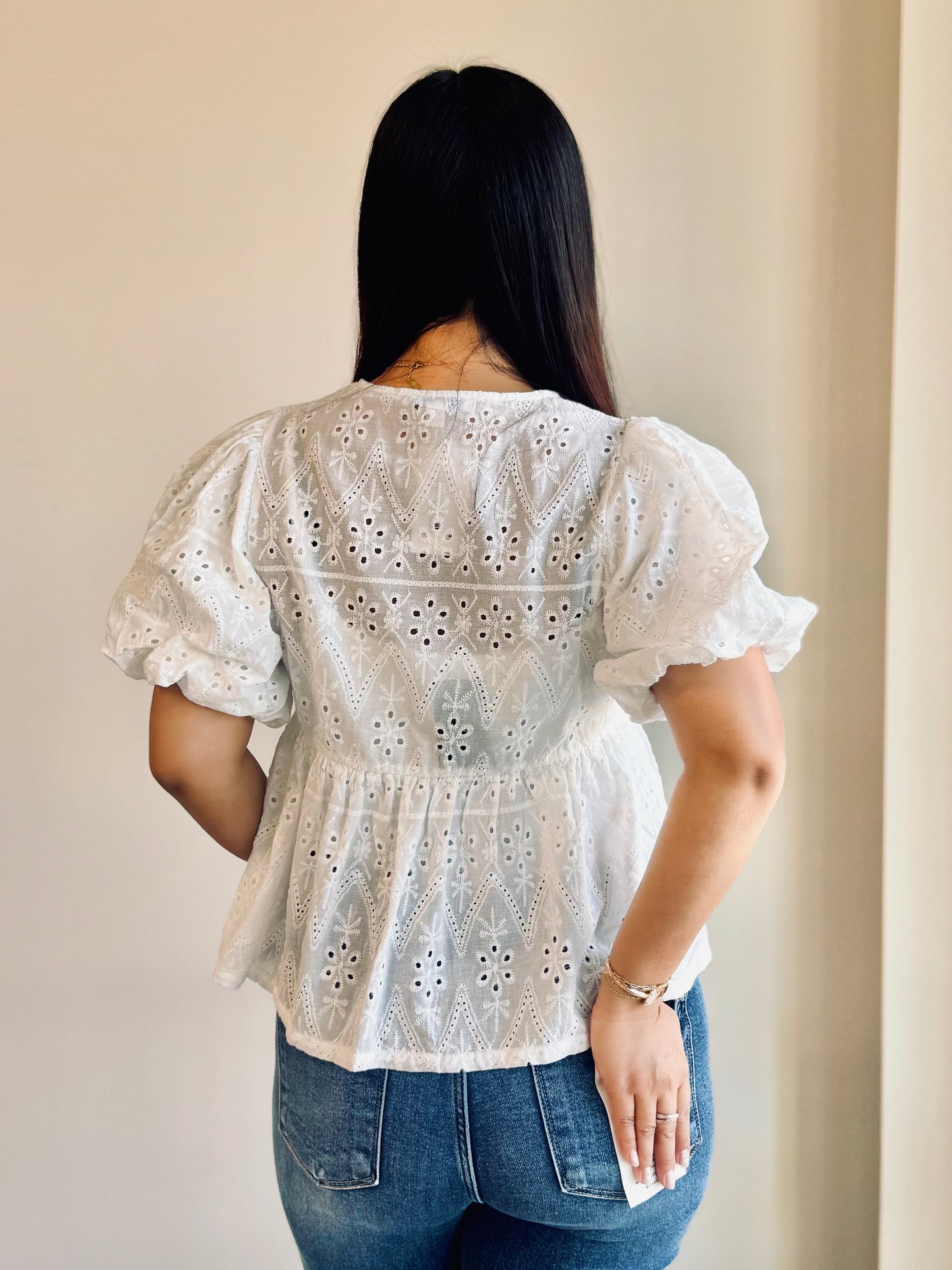 Regular price $21.00Featuring a delicate eyelet designed fabric, a flattering peplum silhouette, and charming puff sleeves, this top combines feminine details with a 3- bow-front tie for a stylish finish. Perfect for both casual outings and dressier occasions, it offers a comfortable fit that enhances your natural shape while adding a touch of elegance to any look.
