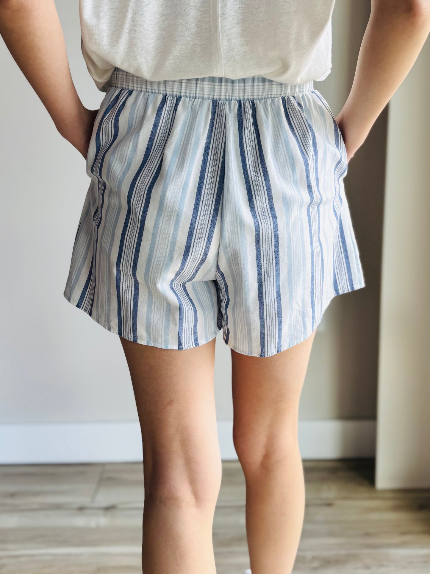 Regular price $16.00Effortlessly chic and comfortable, the Celeste Shorts give you a stylish and versatile look. With an elastic waist tie, these navy, light blue, and white striped shorts are perfect for any occasion.