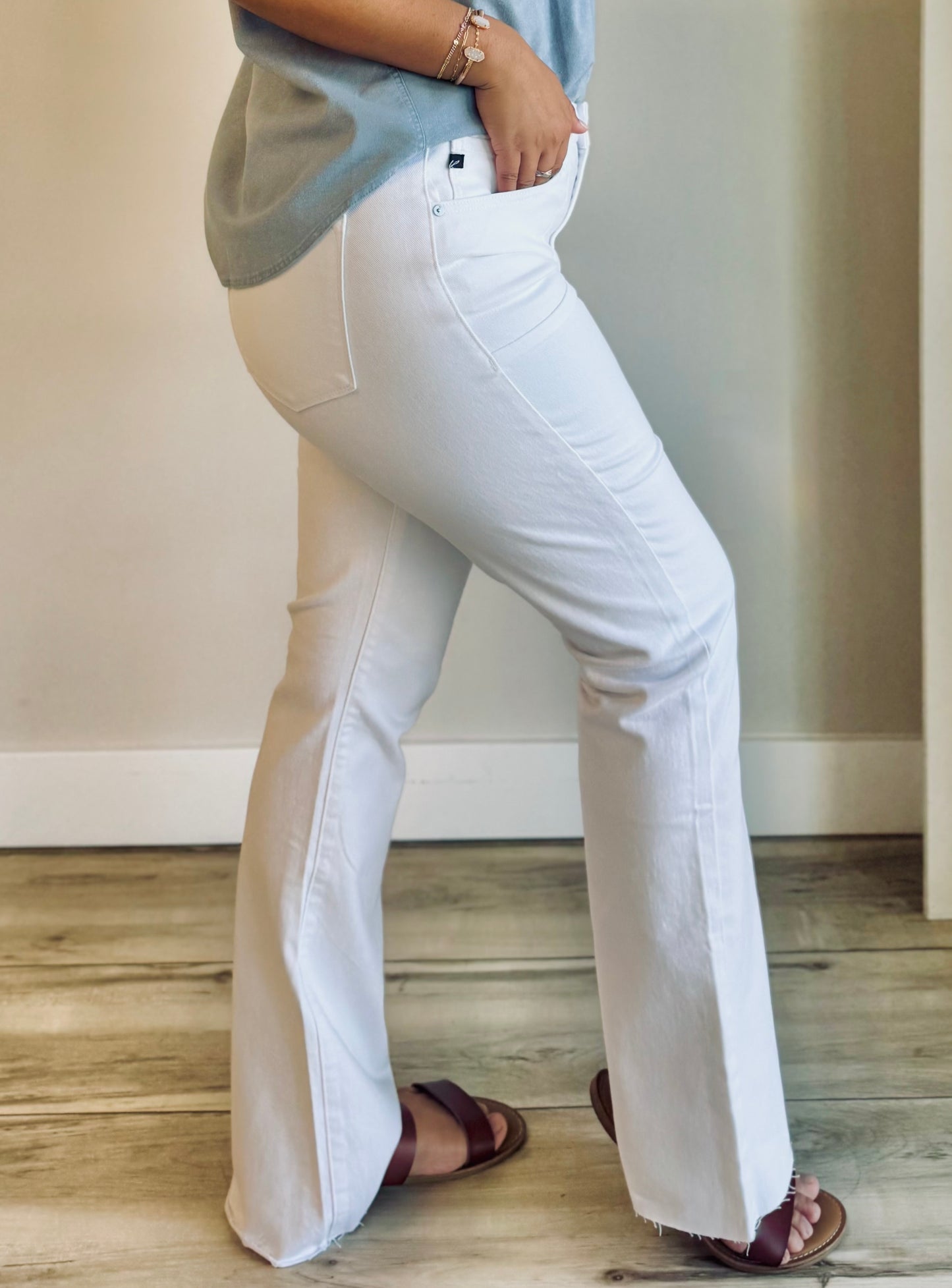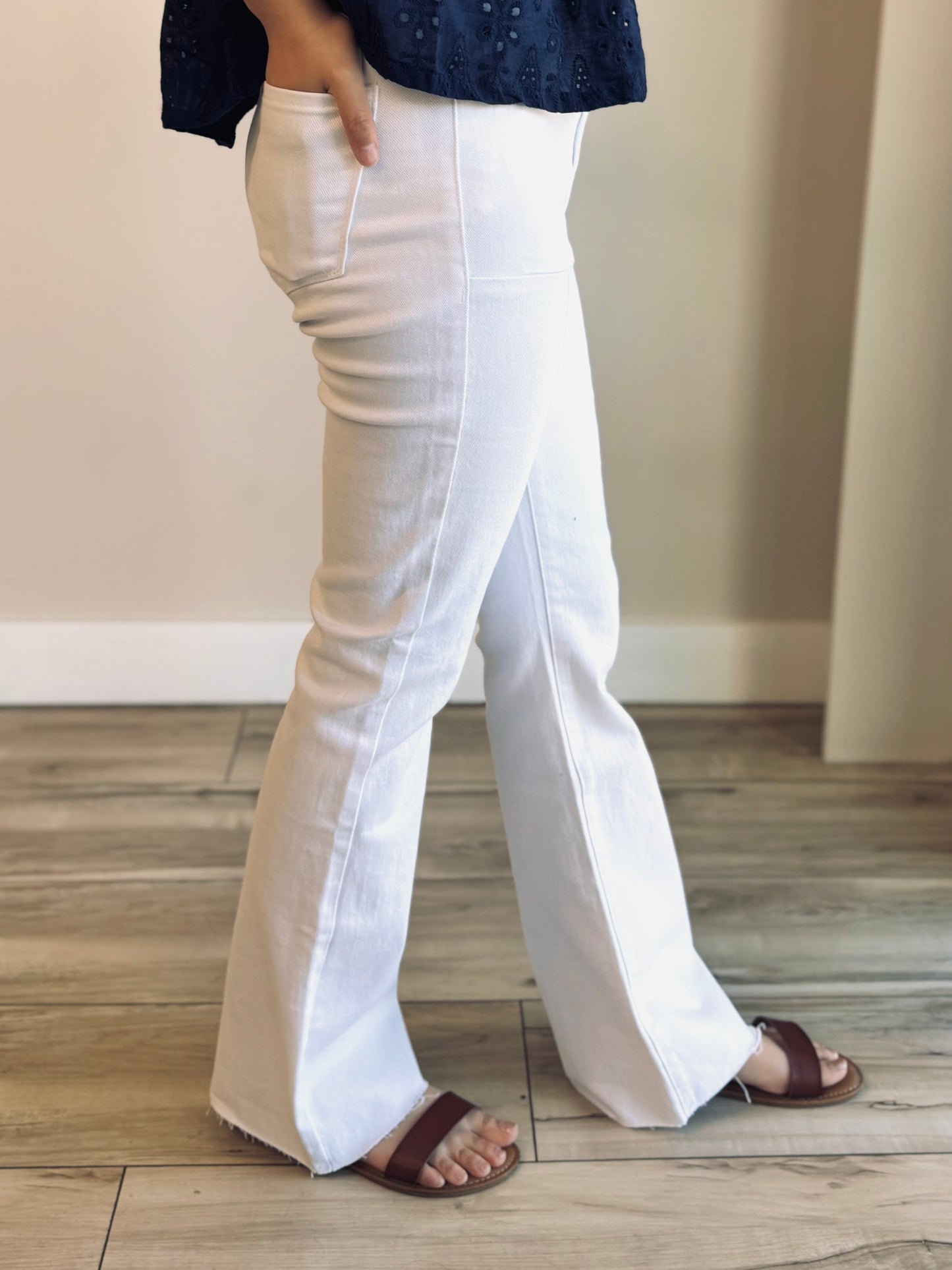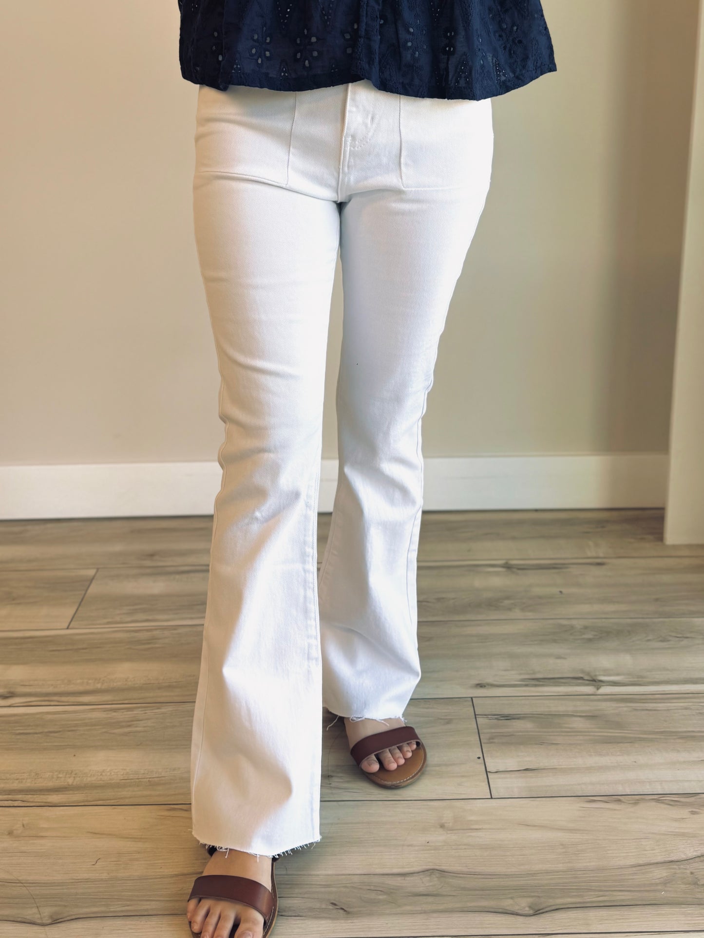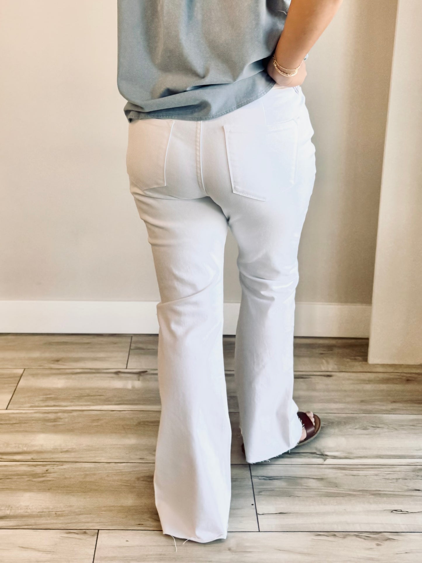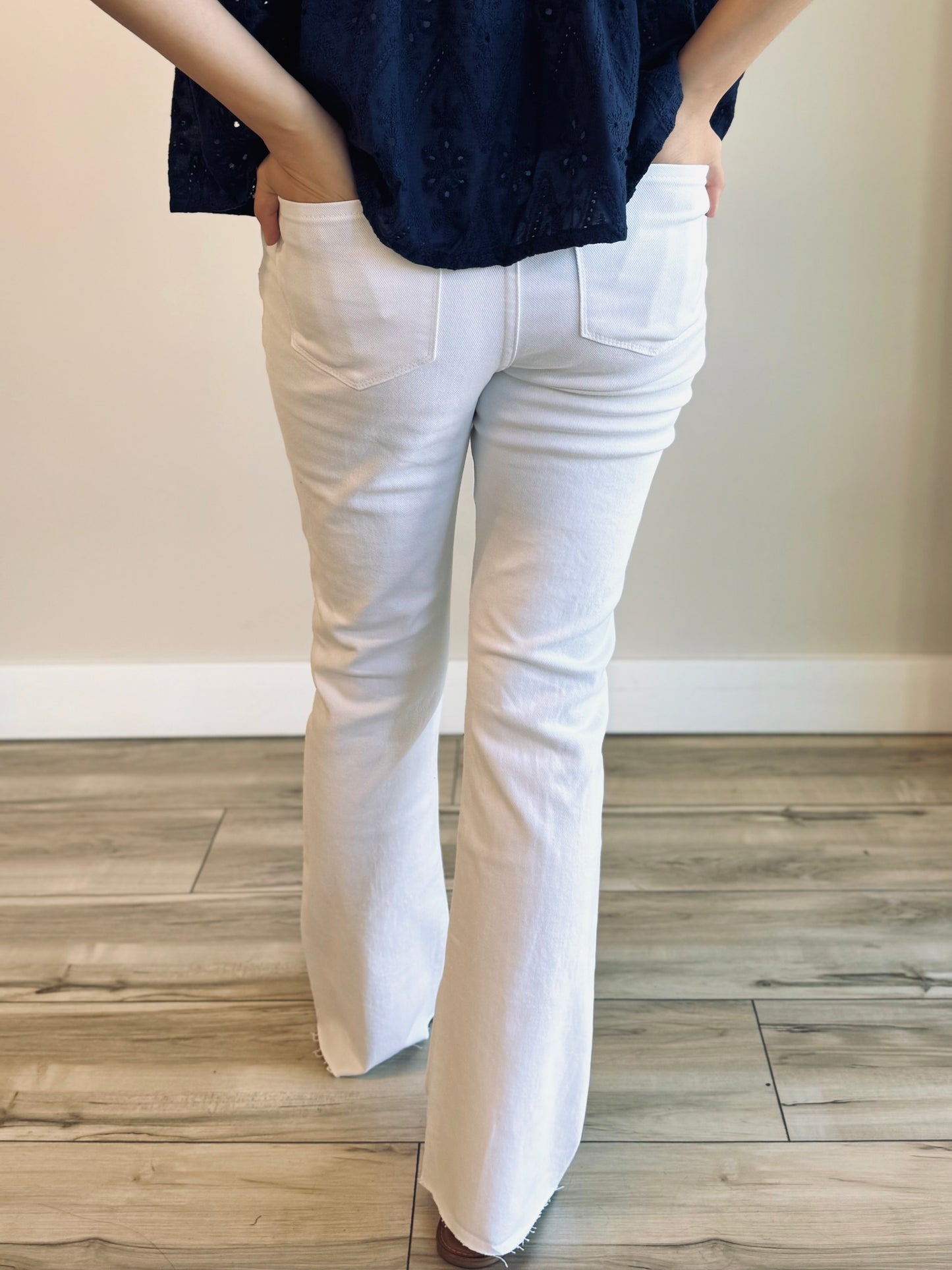 This denim offers a flattering high-rise fit that enhances your silhouette while providing comfortable support throughout the day. Crafted from crisp white denim, these jeans feature a stylish flare that adds a touch of retro charm to any outfit. Perfect for dressing up or down, they combine classic design with modern comfort to help you feel confident and supported wherever you go.