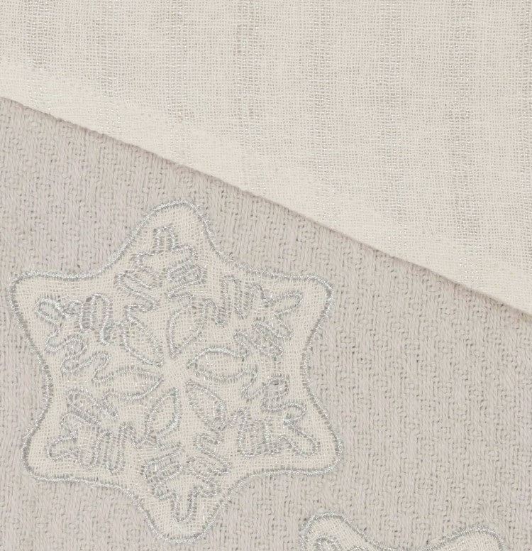 Decorate your home for the holidays, with this super cute stocking. It has an ash grey woven cotton outer shell, appliqued snowflakes in antique white, and a silver lurex for a holiday glimmer.