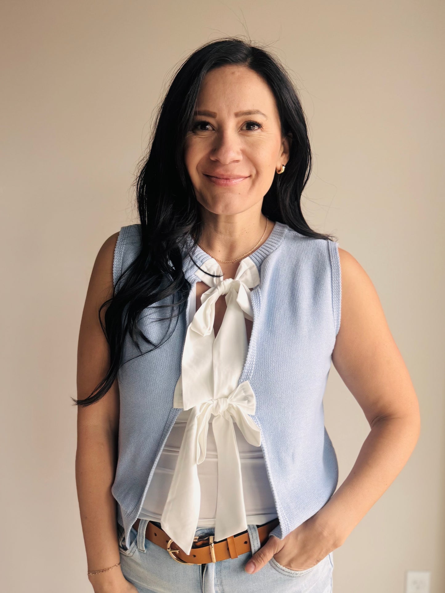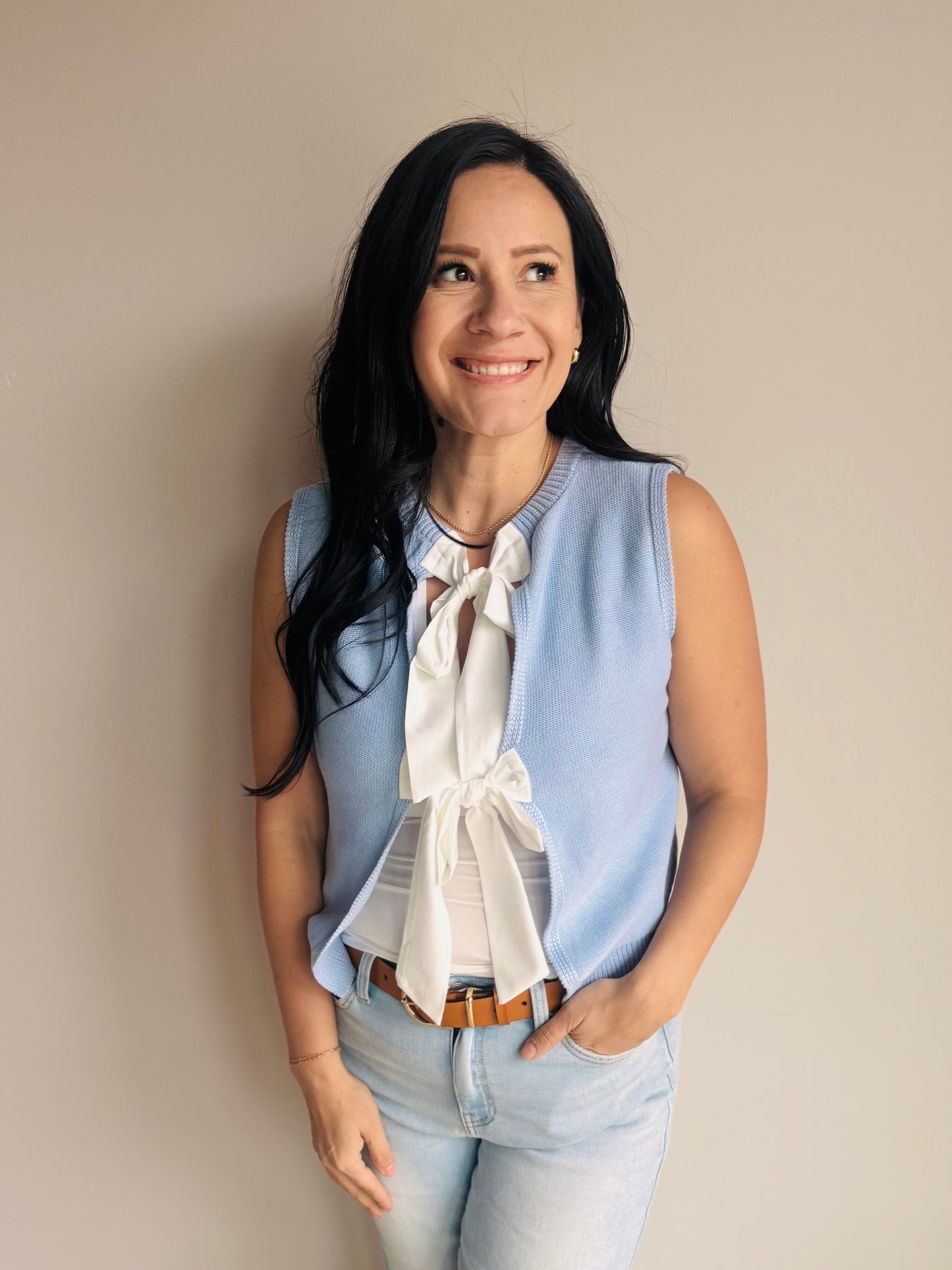 Elevate your layering game with this sophisticated sweater tank top, designed for effortless versatility. The sleeveless silhouette and classic round neckline offer clean, timeless appeal, while the striking contrast bow closure at the back adds an unexpected touch of elegance. Perfect for pairing over collared shirts, under blazers, or worn solo for a polished look.