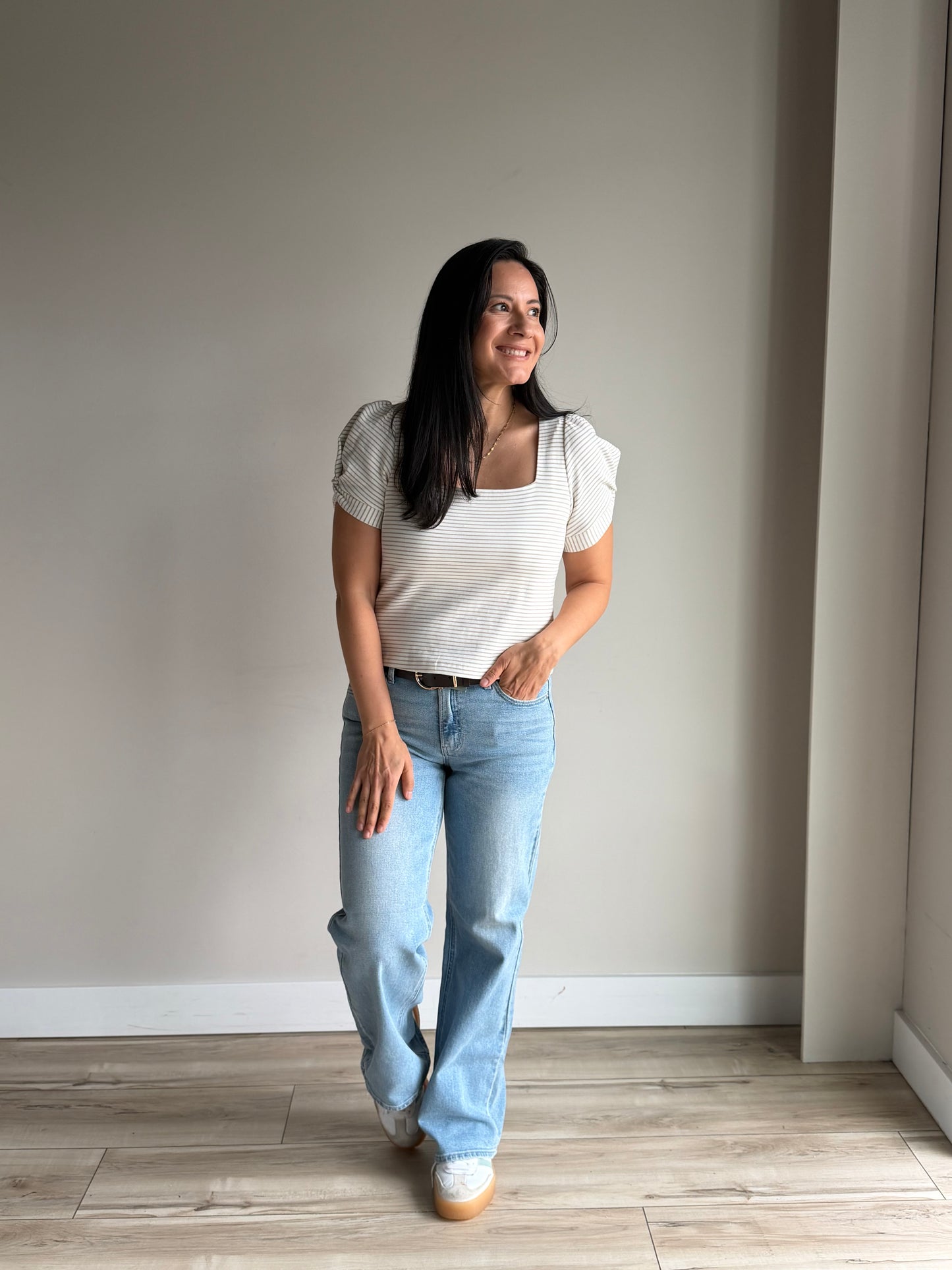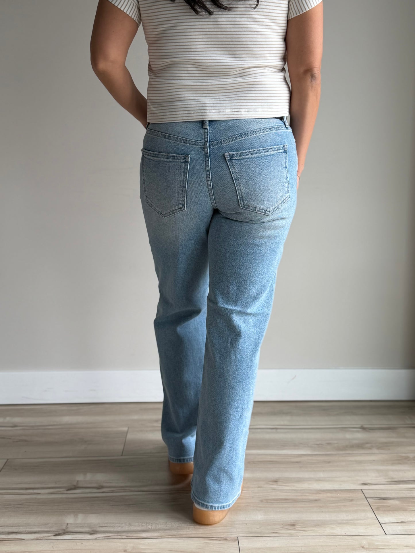 With a flattering high-rise fit and a crisp, full-length straight leg, these jeans offer a fresh, airy feel that's ideal for any day while also bringing timeless style and versatility to your wardrobe.
