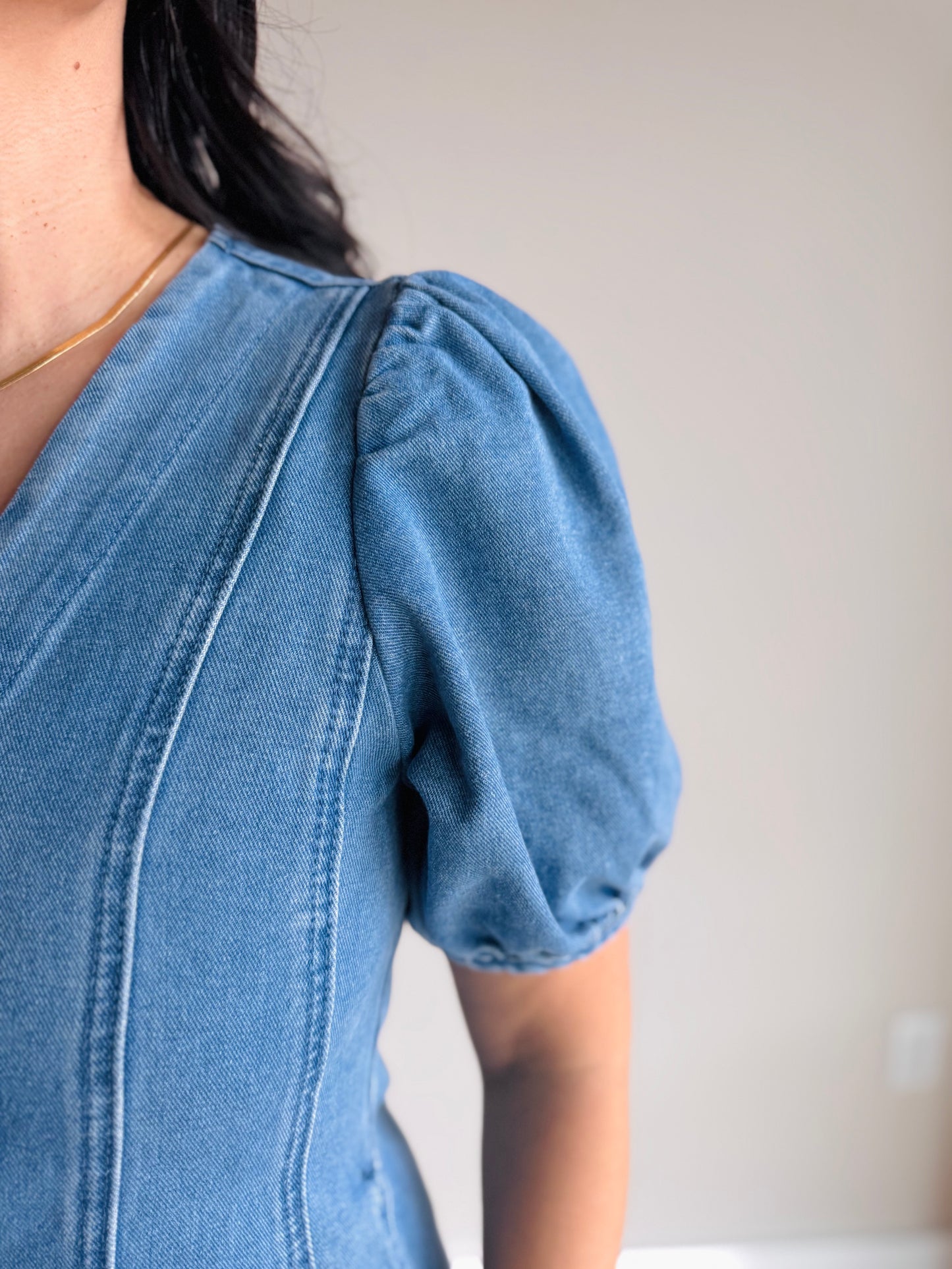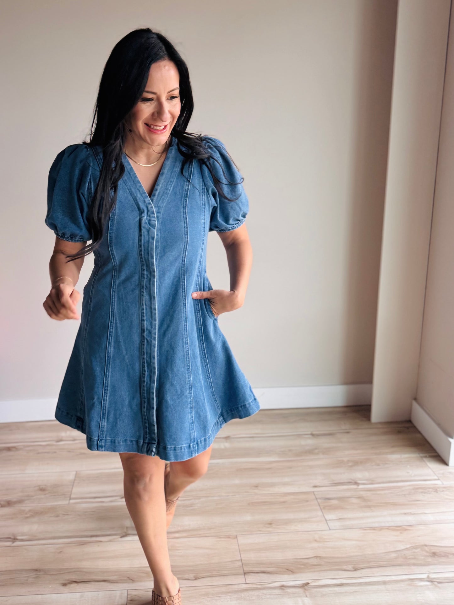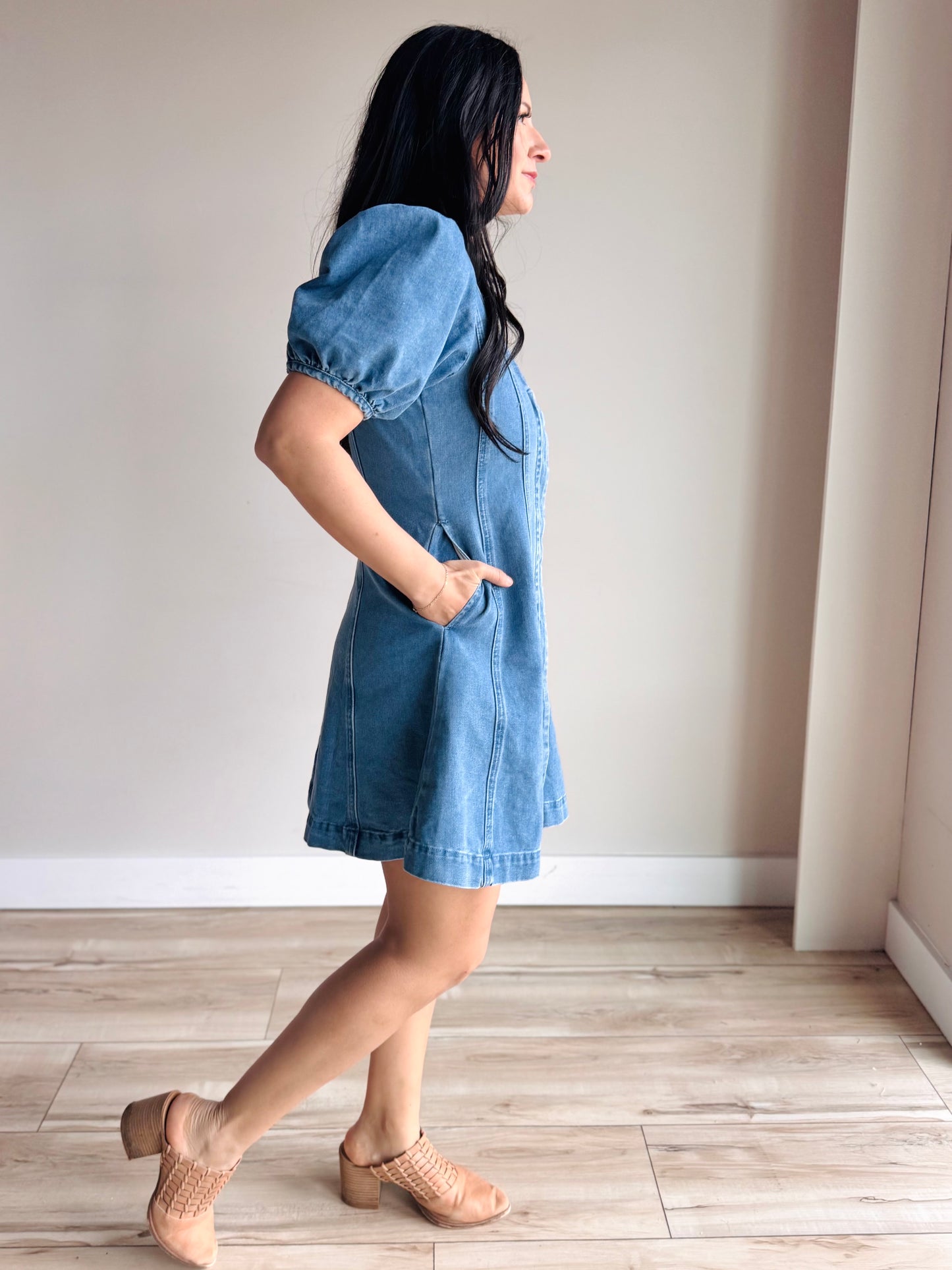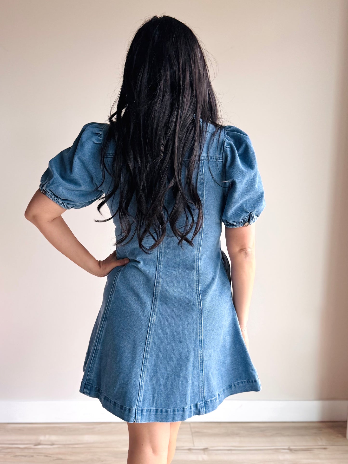 This mini dress features a flattering v-neck and hidden button-down front, paired with structured front seams that create a refined, slimming effect. Puff short sleeves add a touch of feminine charm, while the flared cut offers comfortable movement and a playful, on-trend look. Perfect for casual outings or dressed up for evening plans.