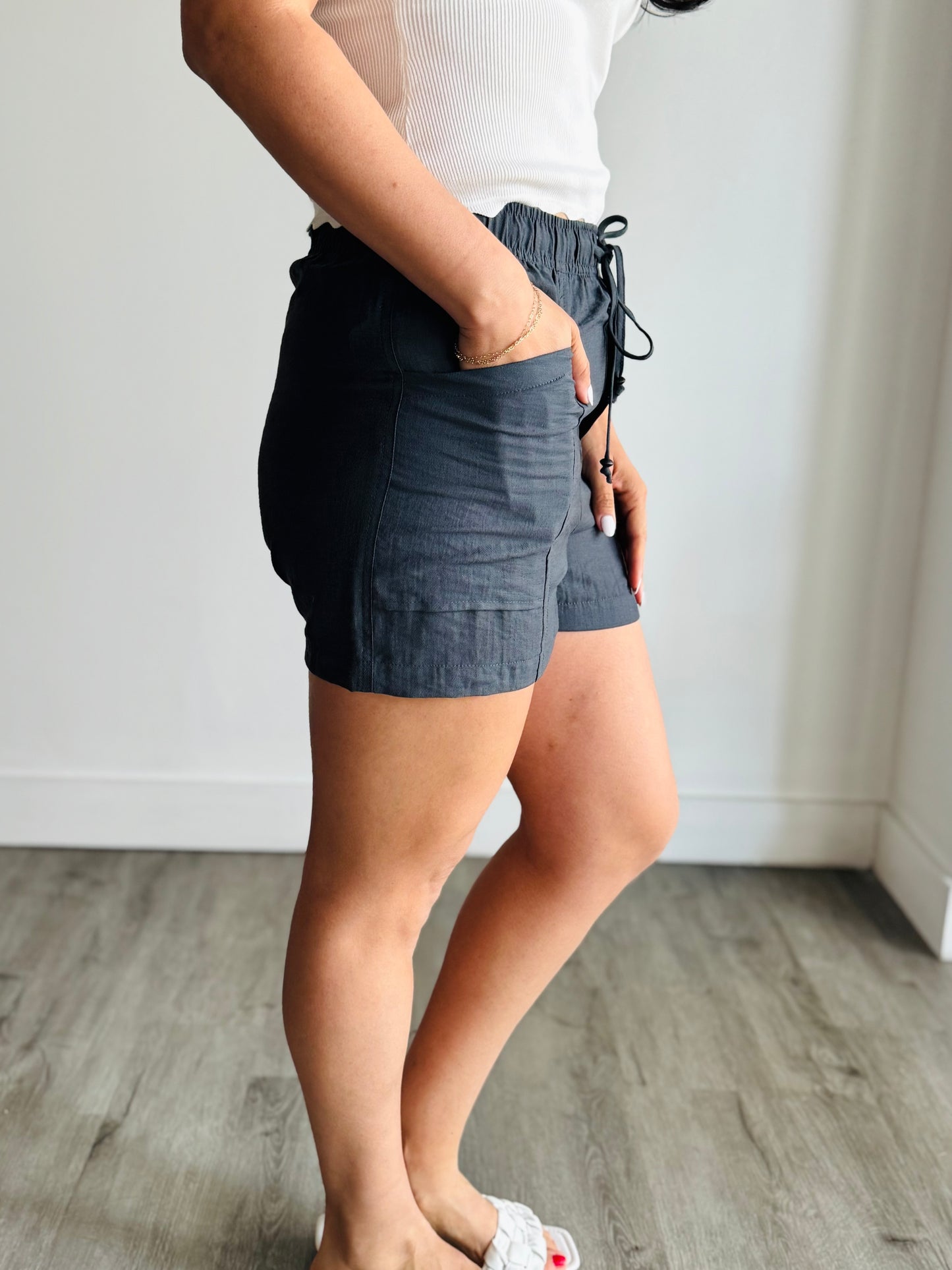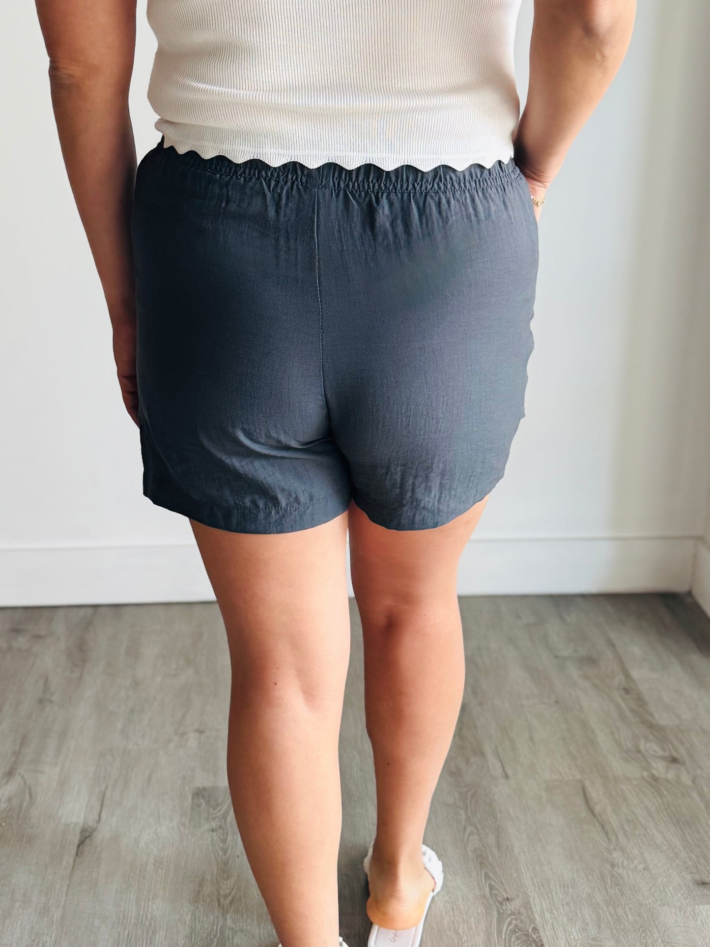Regular price $19.00These shorts feature an elastic waistband with a practical drawstring and convenient patch pockets. The crinkled fabric adds a unique touch to your summer look. Stay comfortable and stylish all season long.