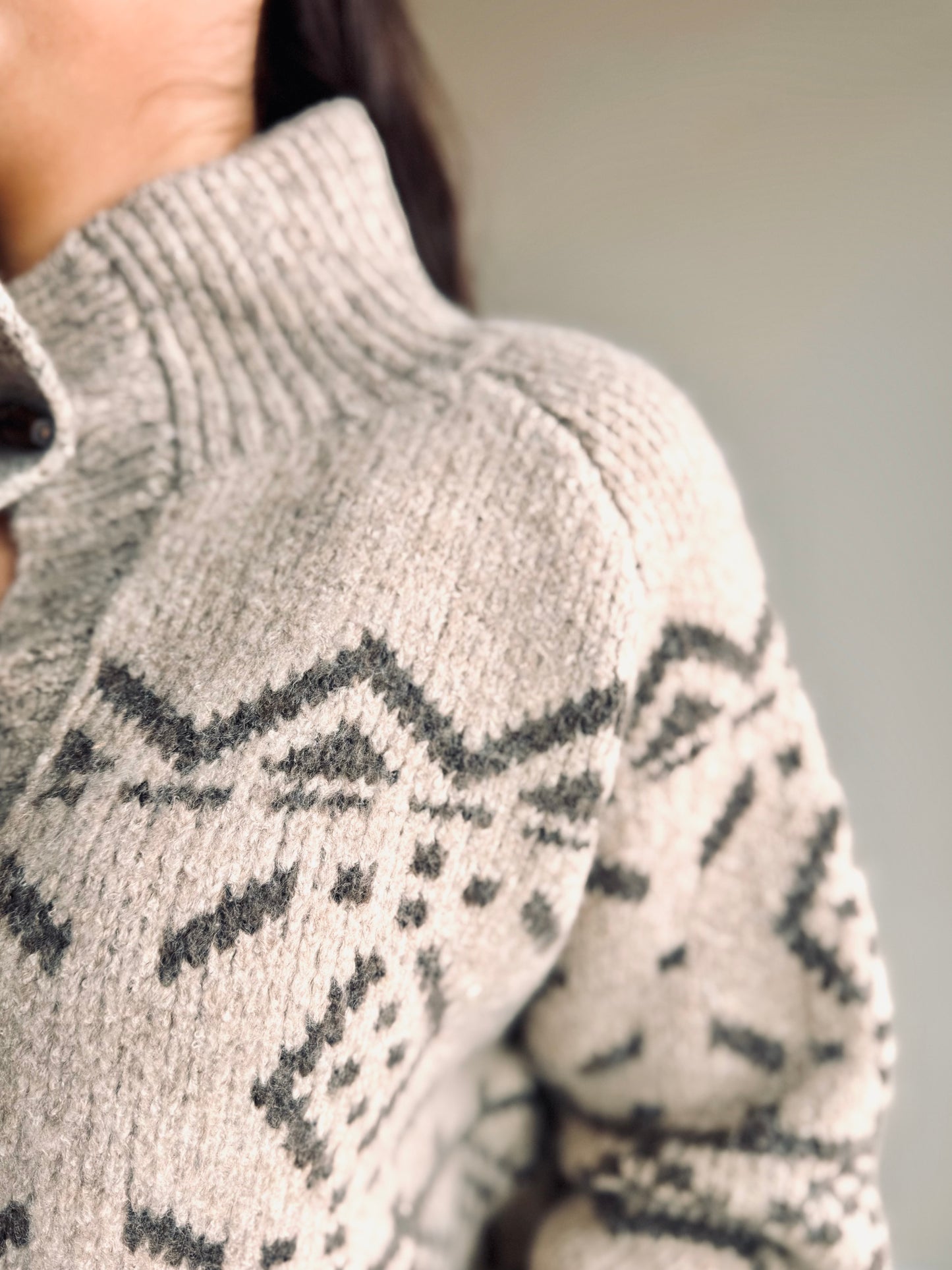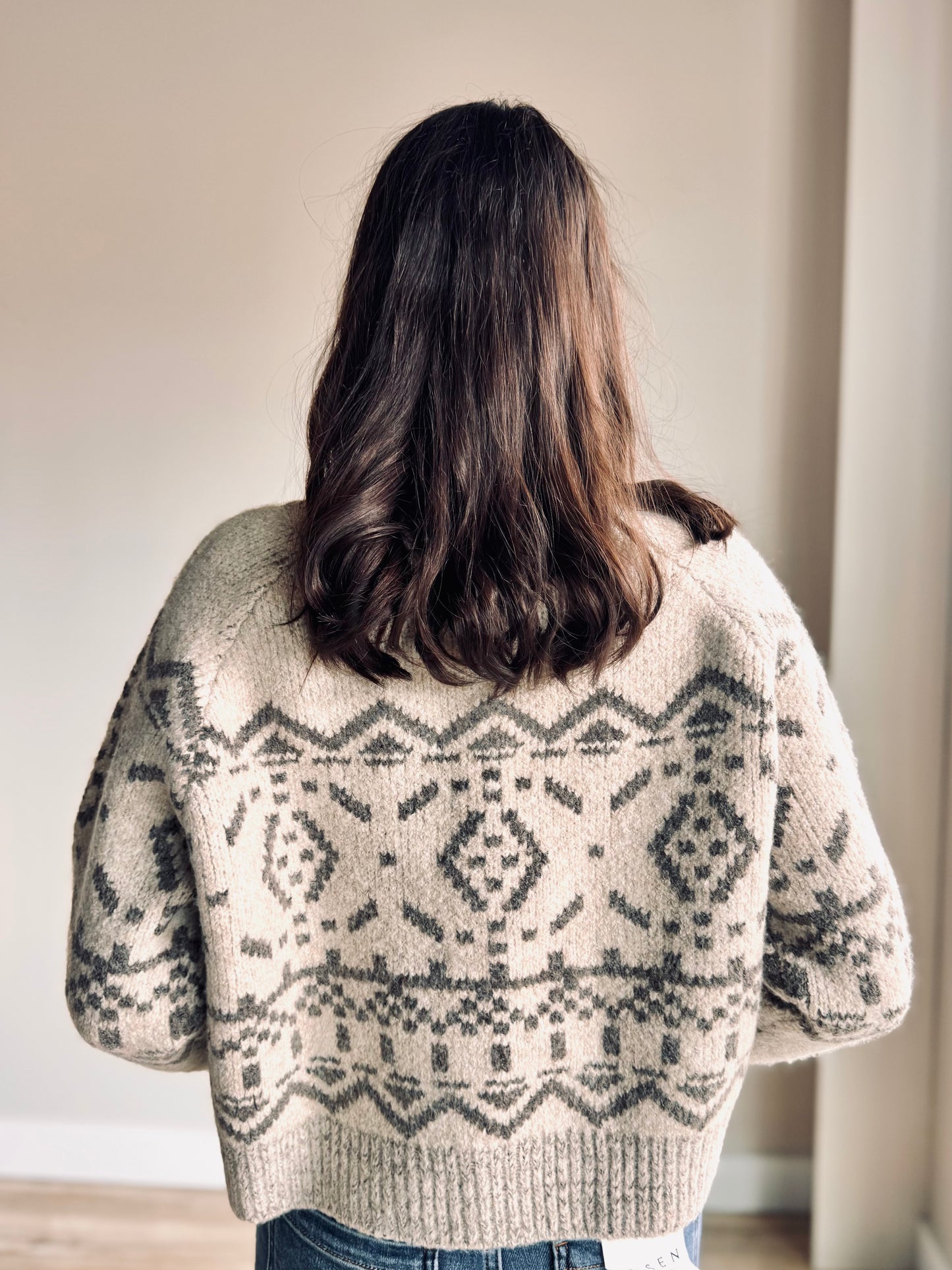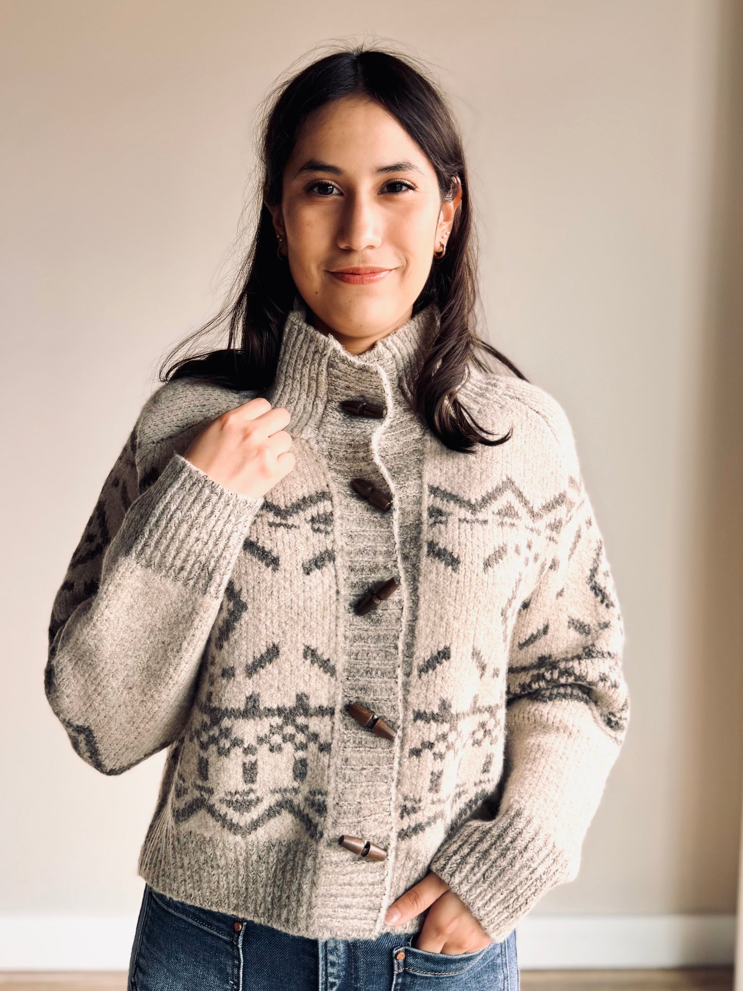 This is a versatile cardigan featuring a fair isle print, mock neck collar, and unique wood bead closures. The relaxed fit provides comfort while the distinctive details elevate your everyday style.